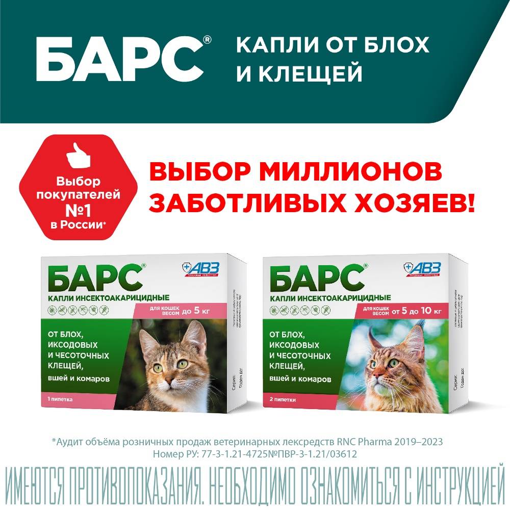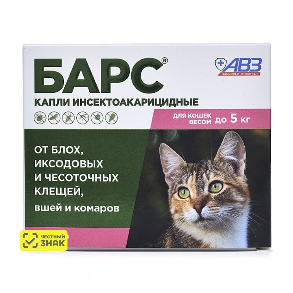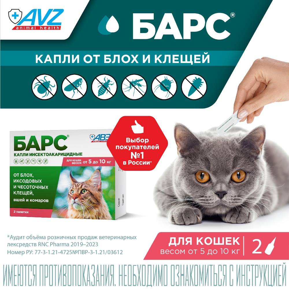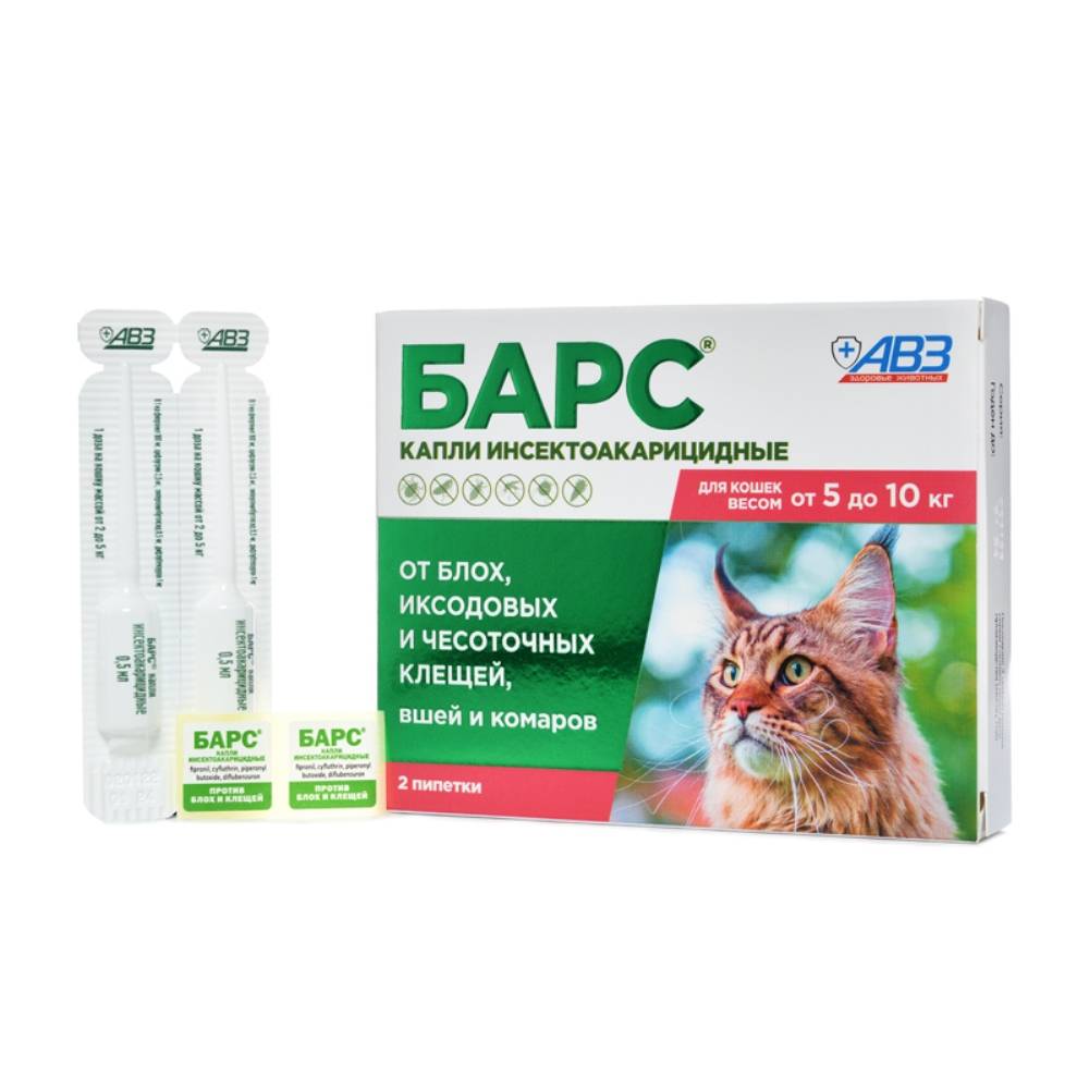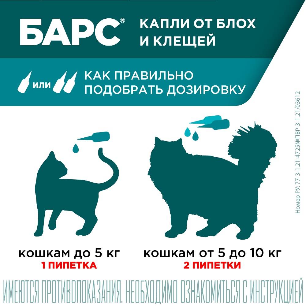 Капли инсектоакарицидные БАРС® применяют кошкам для лечения и профилактики заболеваний вызываемых блохами, иксодовыми клещами, вшами, чесоточными и тромбидиформными клещами, в комплексной терапии аллергического дерматита, вызываемого укусами блох, а также в целях защиты от нападения двукрылых кровососущих насекомых.