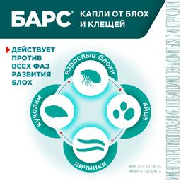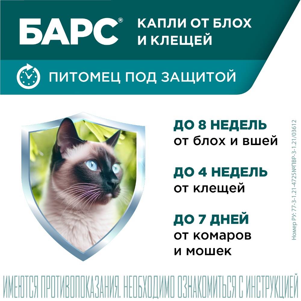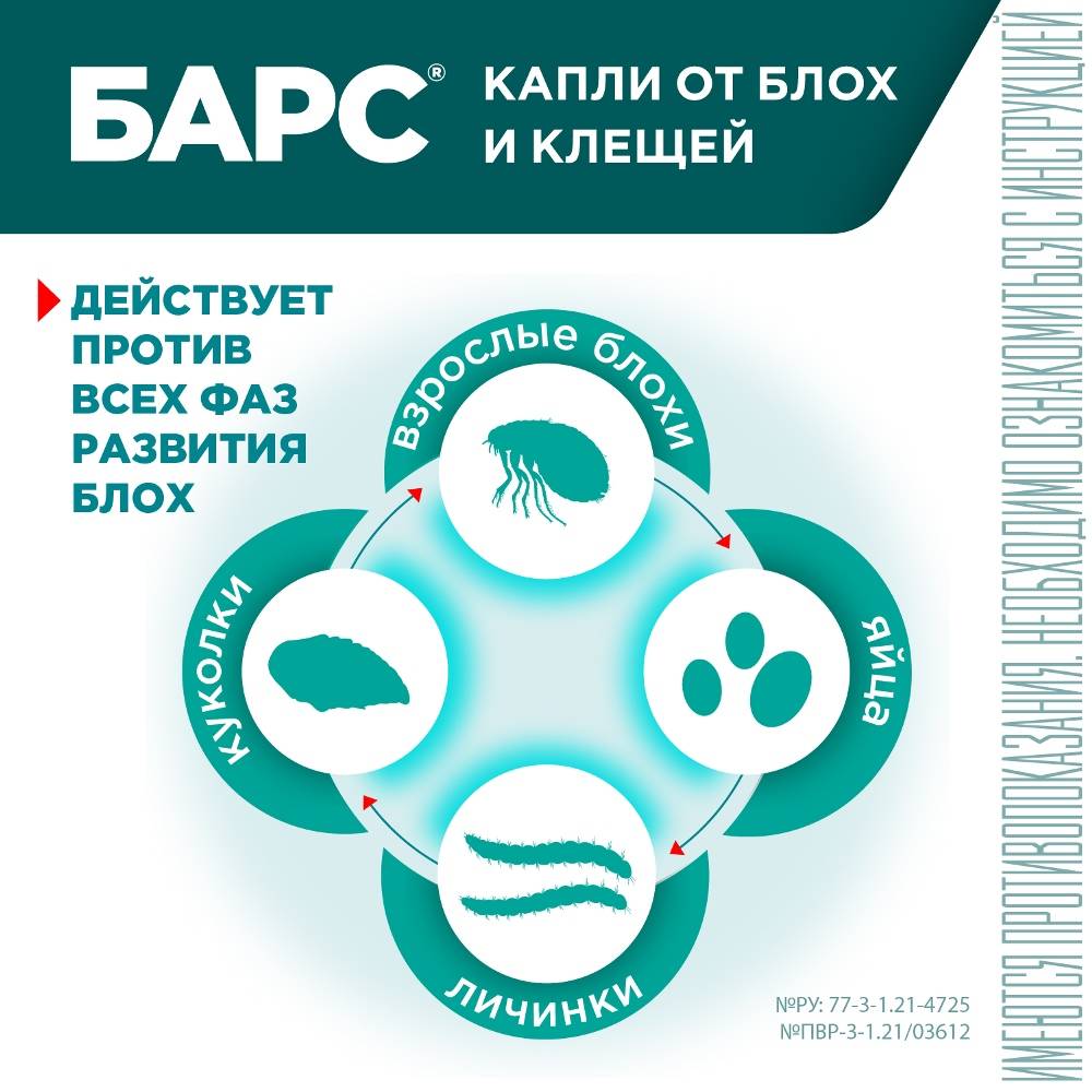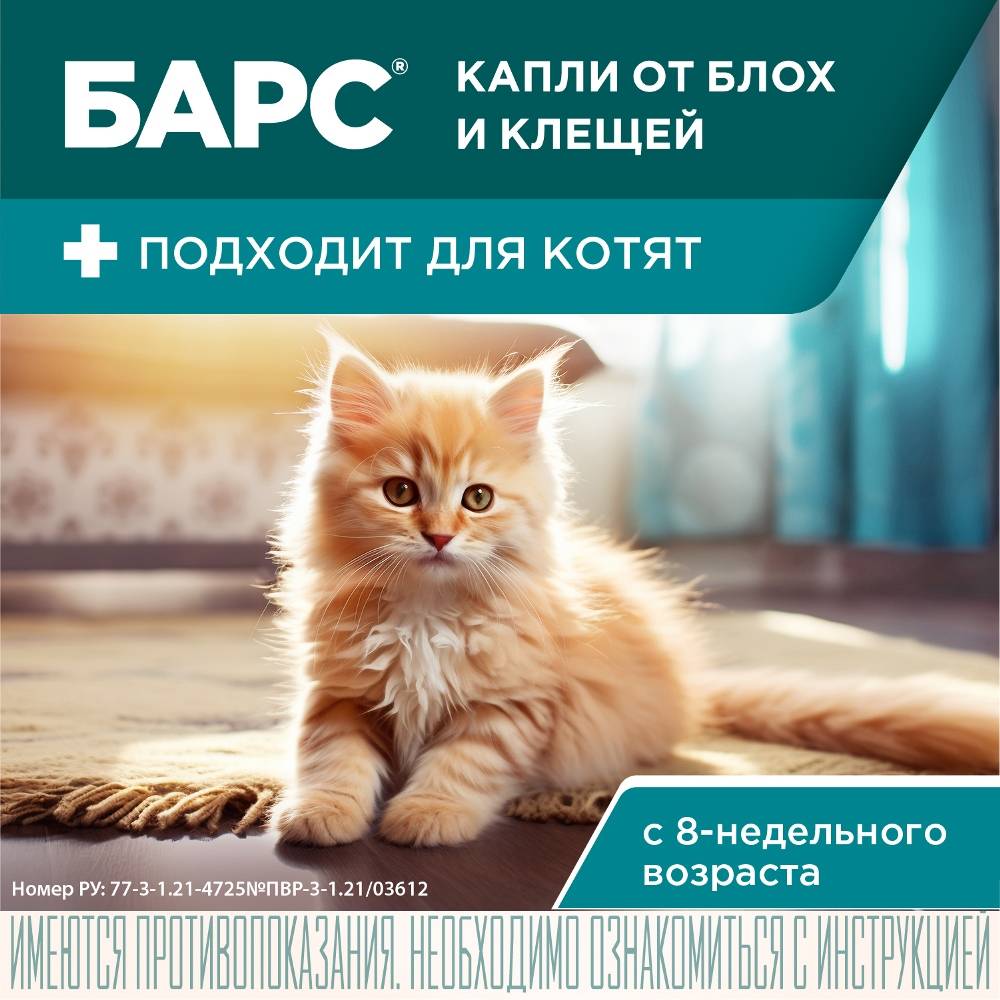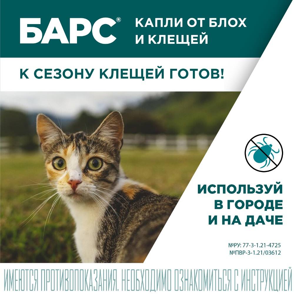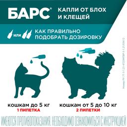Капли инсектоакарицидные БАРС® применяют кошкам для лечения и профилактики заболеваний вызываемых блохами, иксодовыми клещами, вшами, чесоточными и тромбидиформными клещами, в комплексной терапии аллергического дерматита, вызываемого укусами блох, а также в целях защиты от нападения двукрылых кровососущих насекомых.