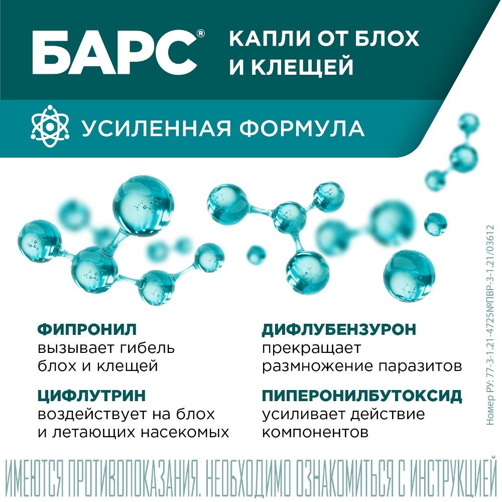Перед обработкой следует слегка постучать по узкому кончику извлеченной из упаковки пипетки (чтобы все содержимое поступило в основной резервуар пипетки), затем отломить или открутить кончик. Раздвинув шерсть, капли инсектоакарицидные БАРС® наносят на кожу питомца в несколько точек вдоль позвоночника (от ушей до области между лопатками и вдоль спины), в места, недоступные для слизывания, избегая попадания препарата на шерсть. Кошкам и котятам препарат наносят на кожу в 2-4 точки.
