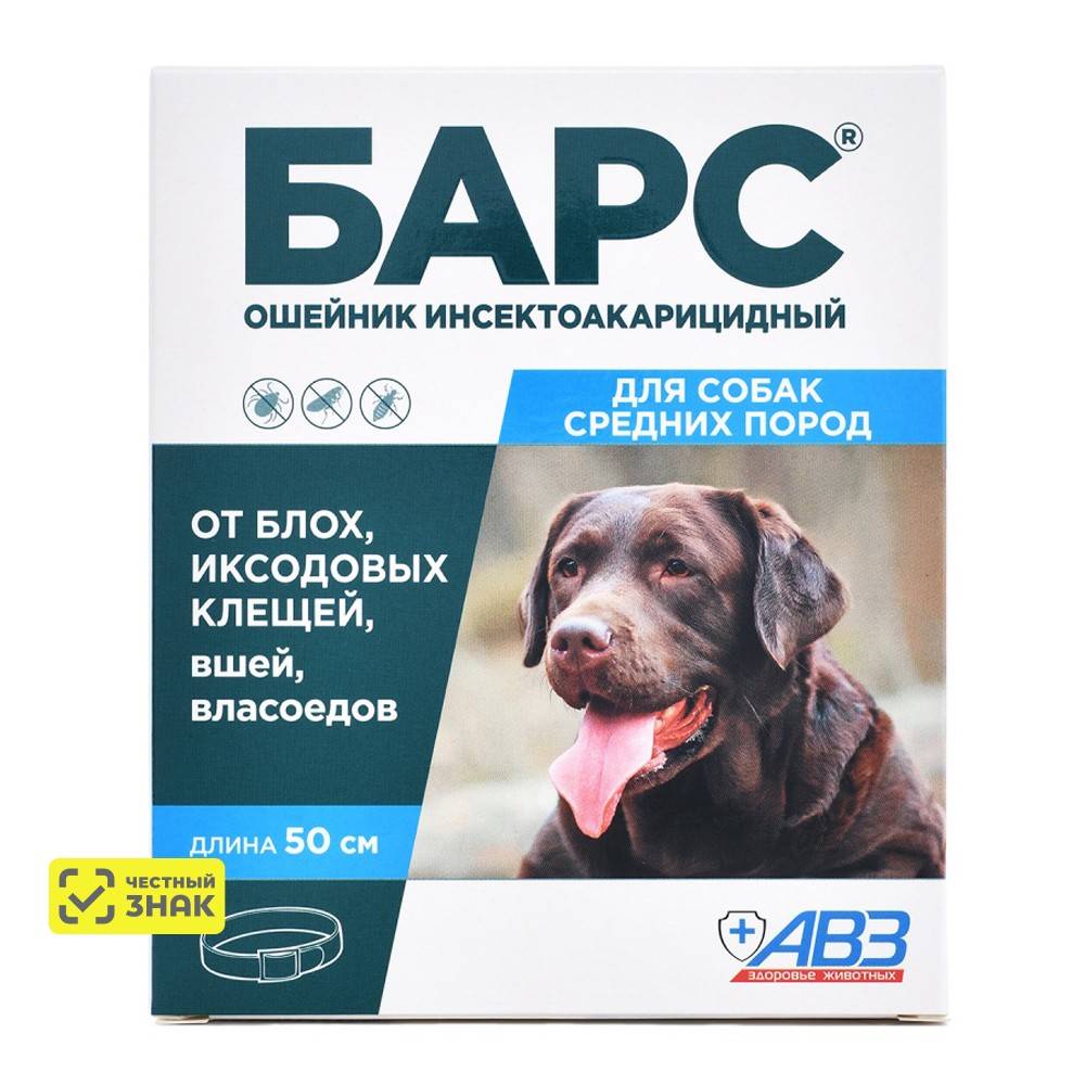 Защита от блох и клещей до 4 месяцев. АВЗ Ошейник Барс для собак средних пород 50 см от блох противостоит кровососущим насекомым на протяжении пяти месяцев. Производится из качественного материла, который пройдет длительный срок службы. Содержит эффективные компоненты, которые отпугивают вредителей. Удобен и практичен в применении. Быстро фиксируется на шее и не вызывает дискомфорта. Длина регулируется за счет люверсов.
