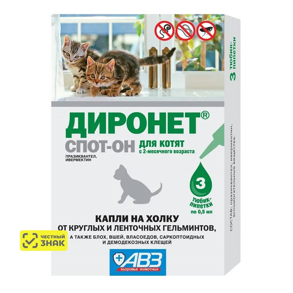 Противопоказанием к применению препарата ДИРОНЕТ® спот-он является повышенная индивидуальная чувствительность животного к компонентам препарата. Запрещается применять котятам моложе 2-месячного возраста, беременным и лактирующим самкам, больным инфекционными болезнями, ослабленным и выздоравливающим животным.
