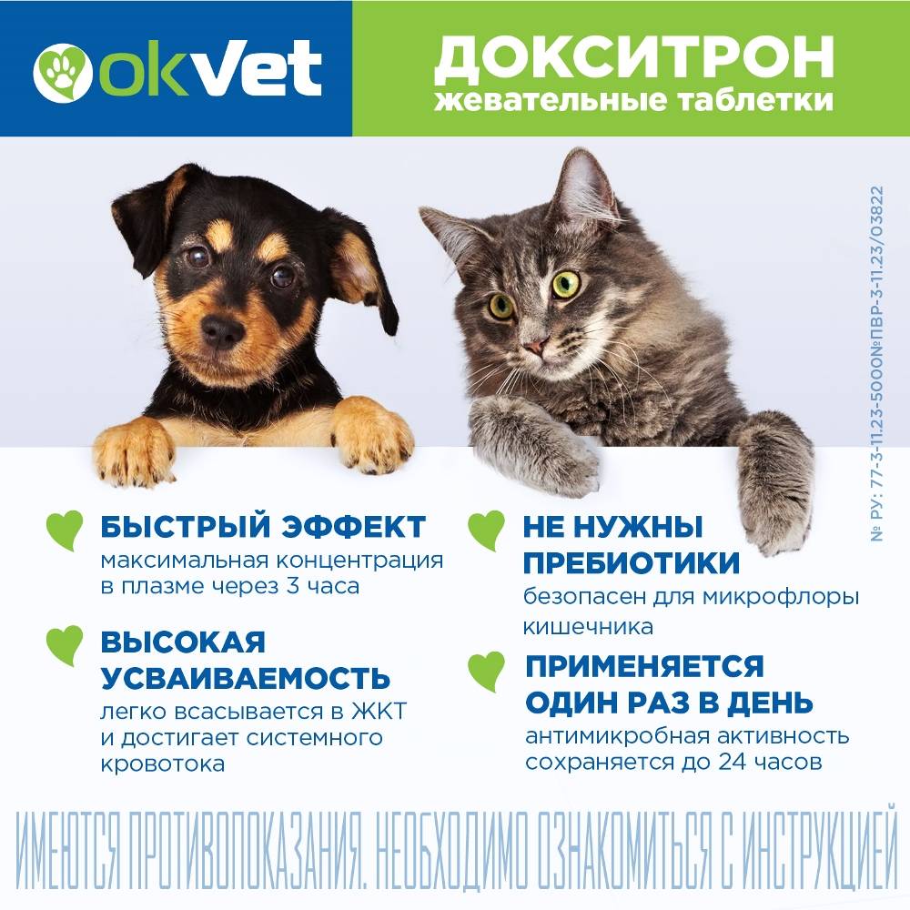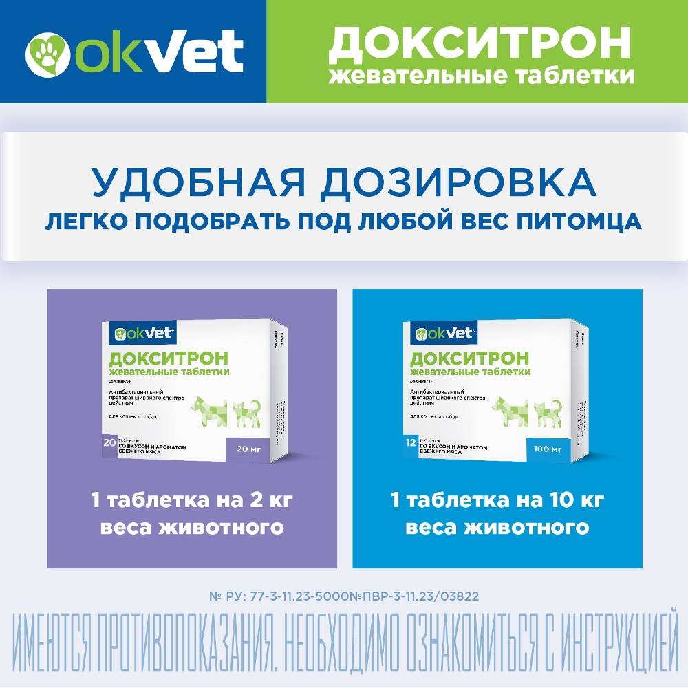Докситрон жевательные таблетки назначают кошкам и собакам с лечебной целью при заболеваниях респираторной системы (ринит, тонзиллит, бронхопневмония), мочеполовой системы (цистит, пиелонефрит, простатит, эндометрит), кожи (гнойные дерматиты, абсцессы) и других ассоциированных инфекциях, вызванных возбудителями, чувствительными к доксициклину.