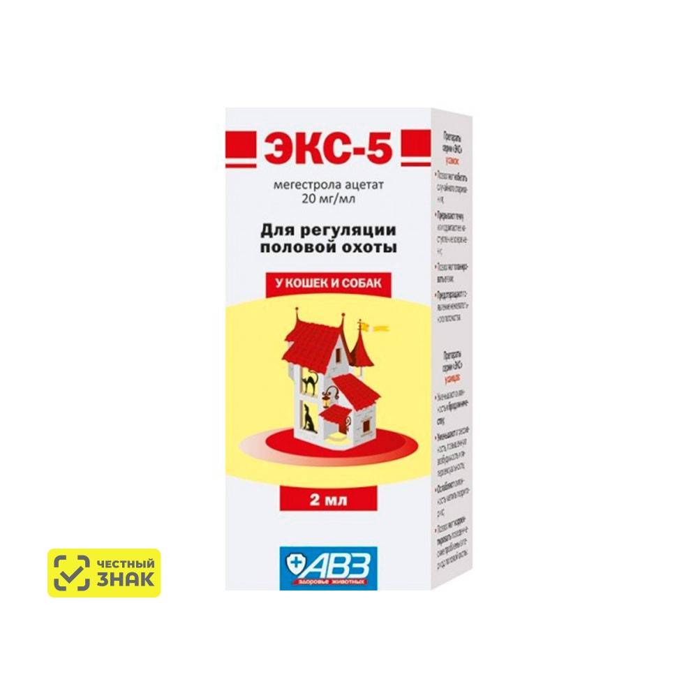ЭКС-5 суспензия для кошек/собак 2 мл фирмы АВЗ содержит гормоны, которые способствуют подавлению половой активности у животных, могут прервать или задержать течку. Предназначается для представителей обоих полов. Особенности использования средства необходимо читать в инструкции. При соблюдении всех предписаний не вызывает побочных эффектов и не имеет негативных последствий.