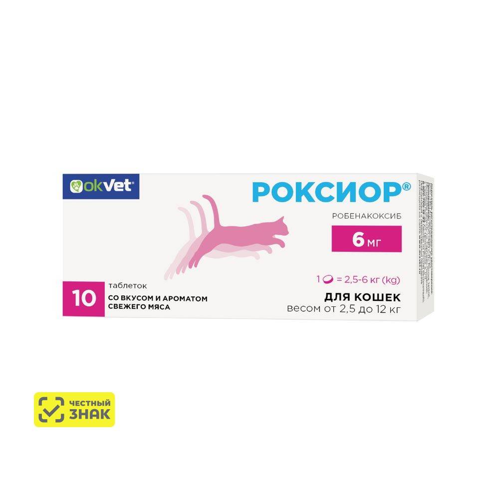 РОКСИОР® применяют кошкам в качестве противовоспалительного и болеутоляющего препарата при воспалительных и болевых синдромах различного происхождения, включая острые и хронические заболевания опорно-двигательного аппарата (артриты, артрозы, синовиты, вывихи), воспалительные заболевания мягких тканей, а также в качестве анальгезирующего и противовоспалительного препарата в послеоперационный период.