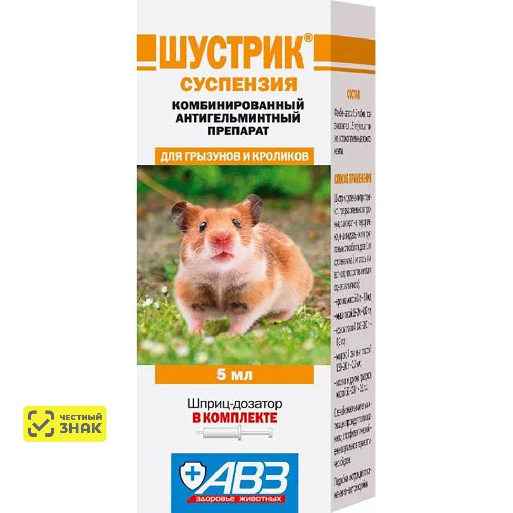 АВЗ Шустрик суспензия антигельминтная для грызунов используется в профилактических и лечебных целях. Содержит компоненты, не вызывающие негативного влияния на здоровье любимца. Эффективно противостоит паразитам, быстро уничтожая их в организме. Не разрушает иммунную систему. Перед применением следует ознакомиться с инструкцией, во избежание побочных явлений.