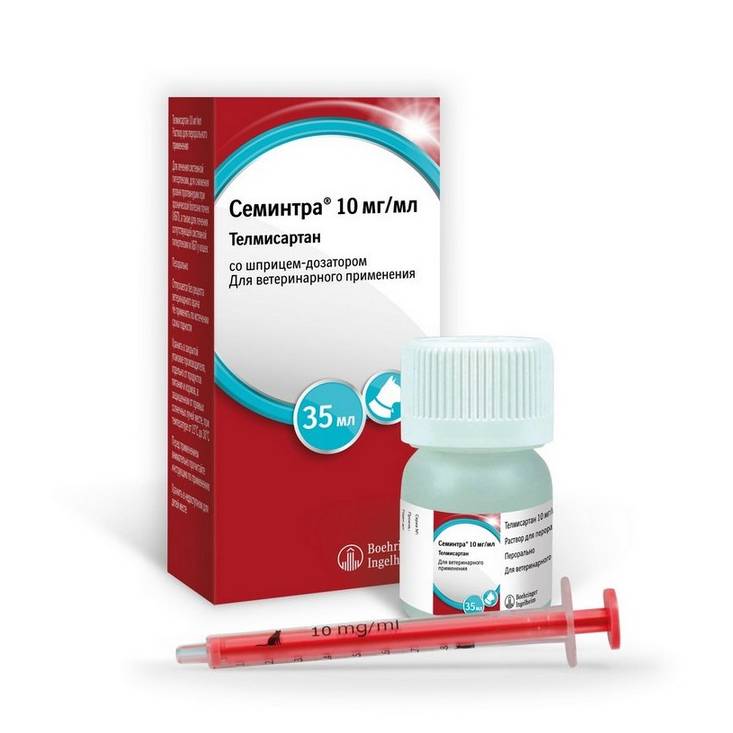 - Семинтра® содержит телмисартан, который имеет дозозависимый эффект по снижению артериального кровяного давления у млекопитающих, в том числе кошек.