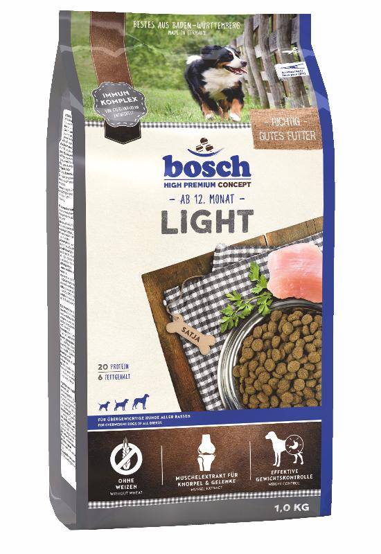 Бош Лайт - низкокалорийный сухой корм с пониженным (6%) содержанием жиров и высоким (7%) содержанием клетчатки. Этот рацион предназначен для собак, склонных к полноте, и собак с избыточным весом.