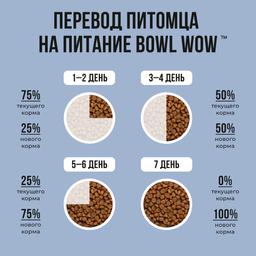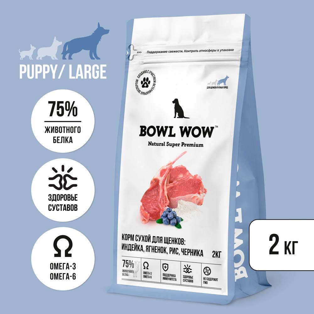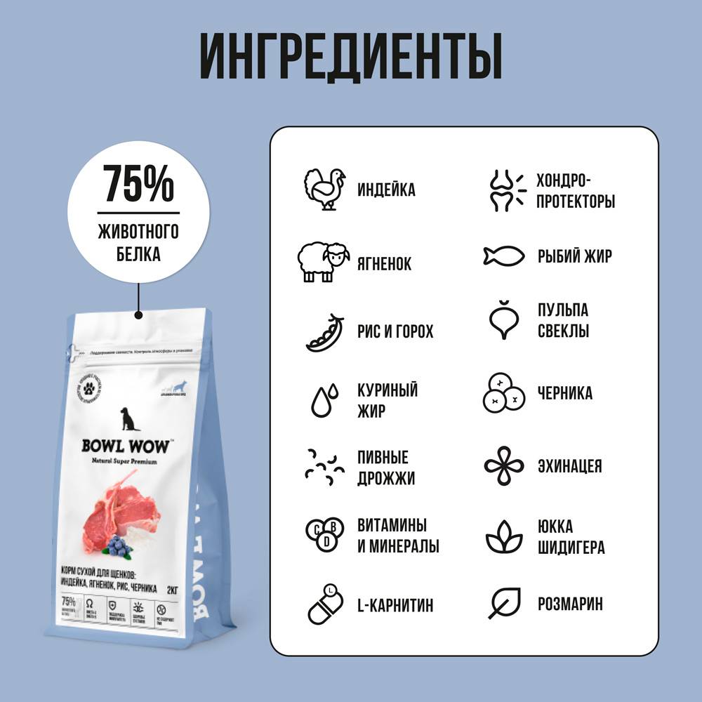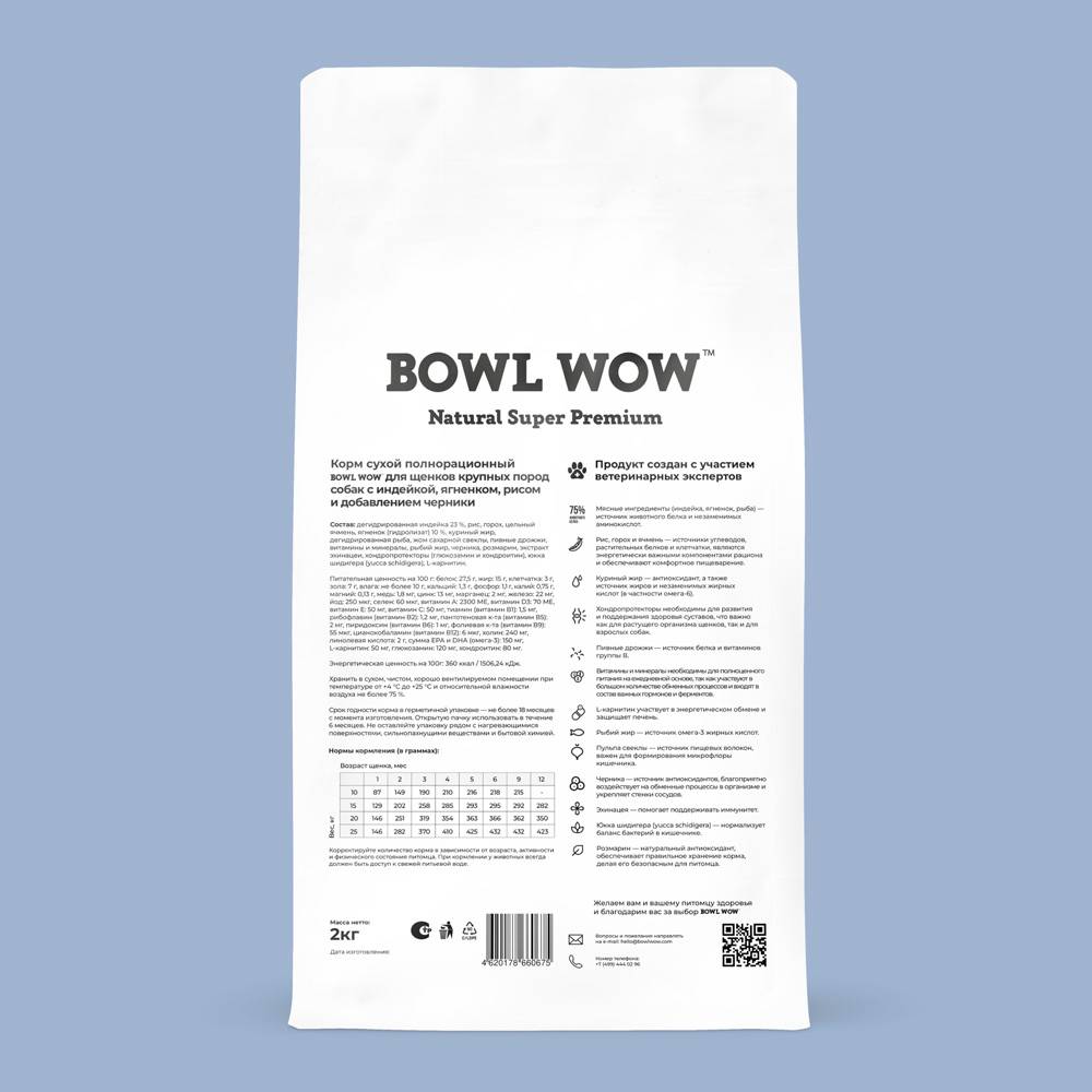Полнорационный корм BOWL WOW с индейкой, ягненком, рисом и черникой — это формула, разработанная специально для щенков и учитывающая особенности крупных пород (весом от 25 кг), ведь основу здоровья необходимо заложить в самом раннем возрасте. В составе рациона — повышенное содержание белка, все необходимые жиры, углеводы, витамины и микроэлементы, а также специальные компоненты для поддержания здорового развития суставов и иммунитета. Размер гранул 12–14 мм специально разработан для щенков крупных пород.