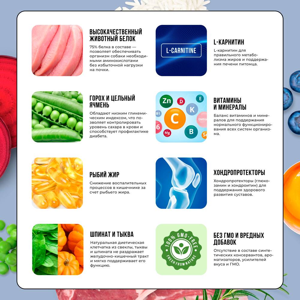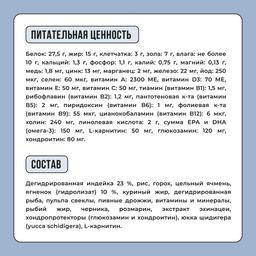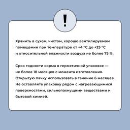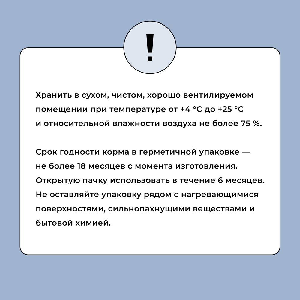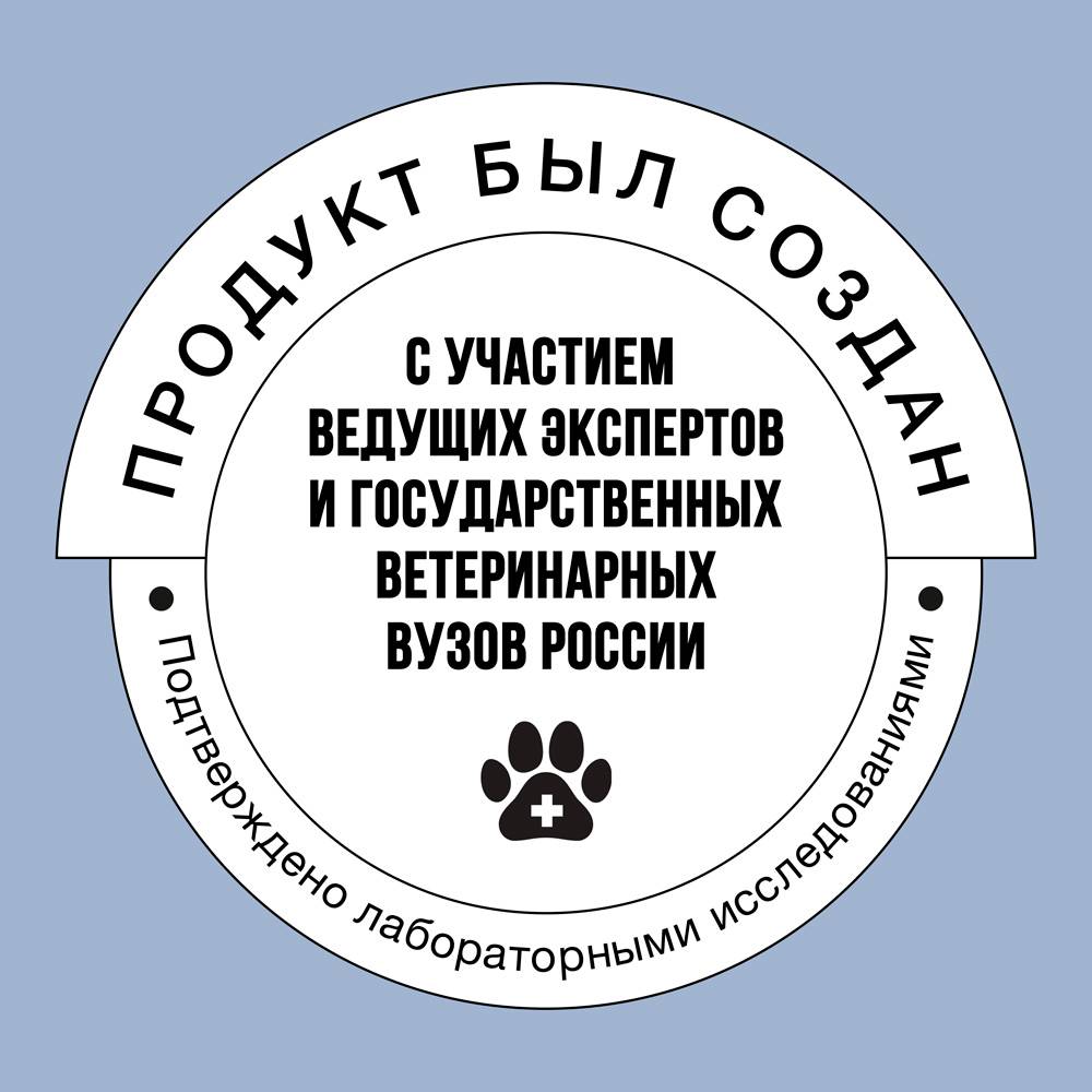 - Соответствие нормам по кормам FEDIAF, AAFCO, NRC и российскому ГОСТу Р 55453-2022.