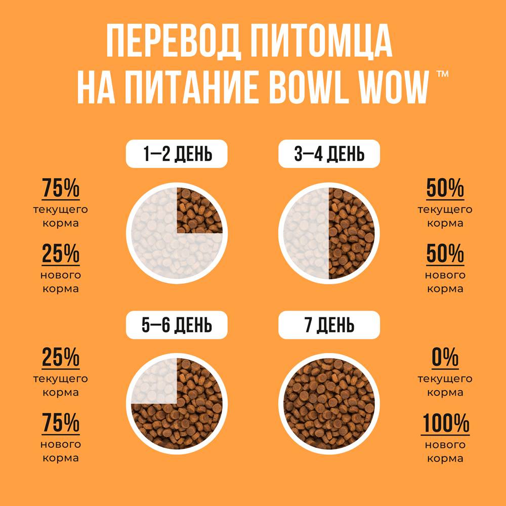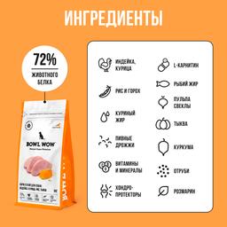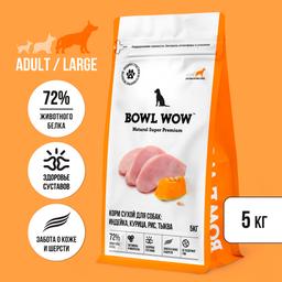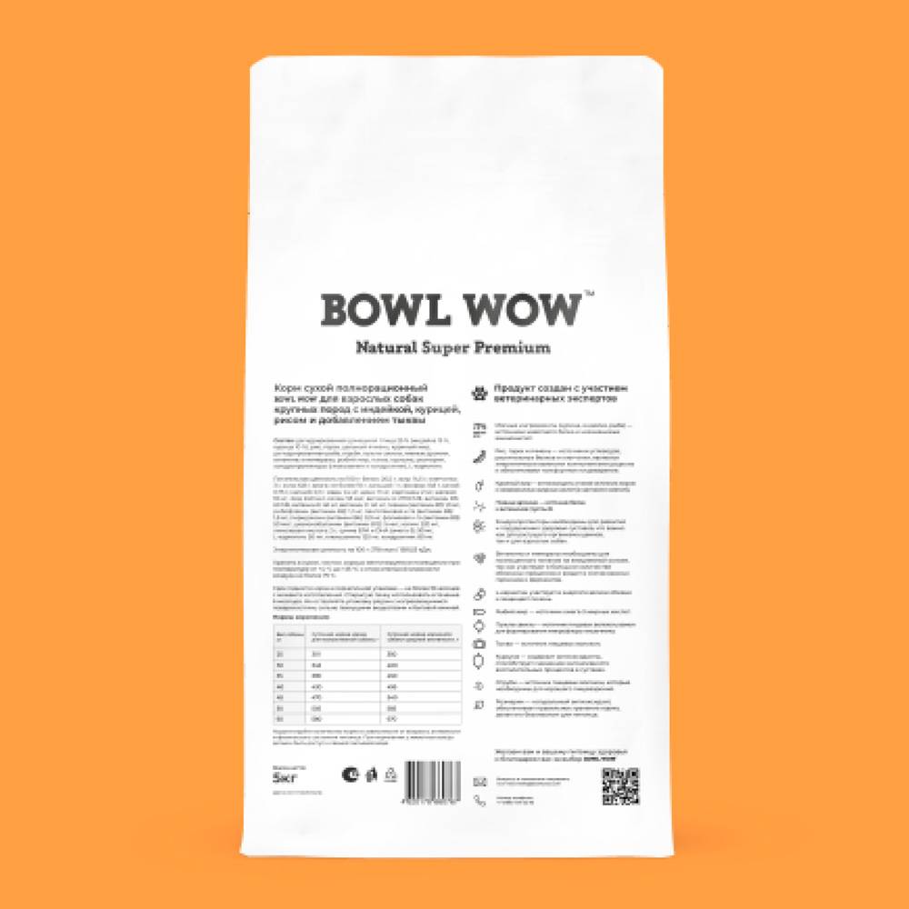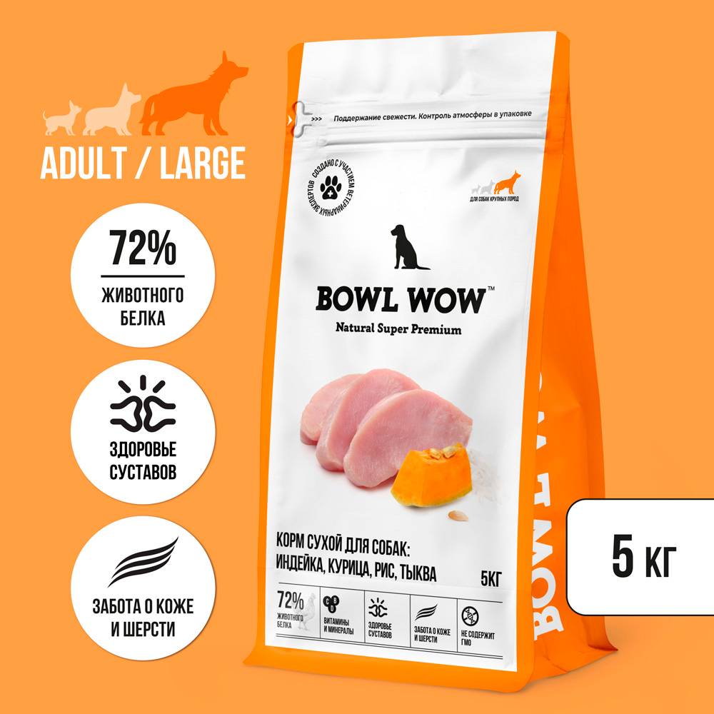 Полнорационный корм BOWL WOW с индейкой, курицей, рисом и тыквой разработан специально для собак крупных пород (весом от 25 кг). В его состав, помимо полного набора белков, жиров, углеводов, витаминов и микроэлементов, введены компоненты для поддержки иммунитета, суставов и заботы о здоровье кожи и шерсти вашего питомца. Размер гранул 17–19 мм специально разработан для взрослых собак крупных пород.