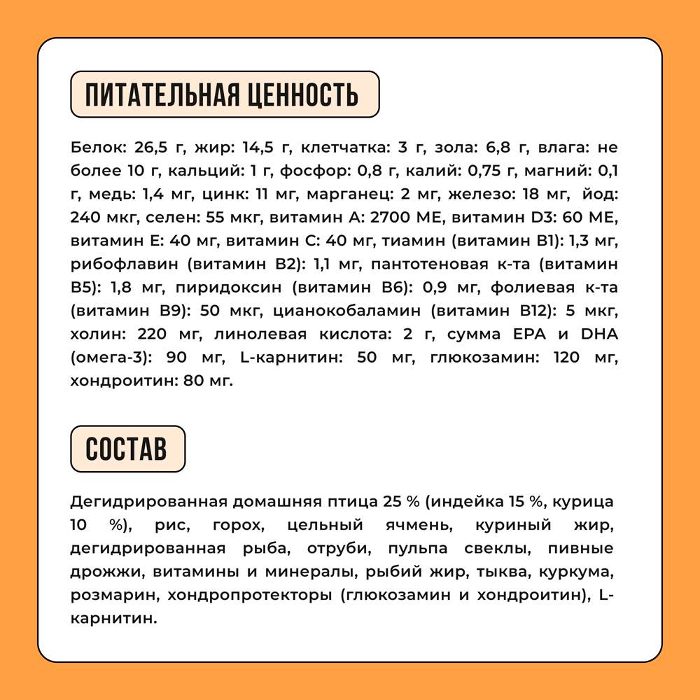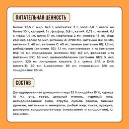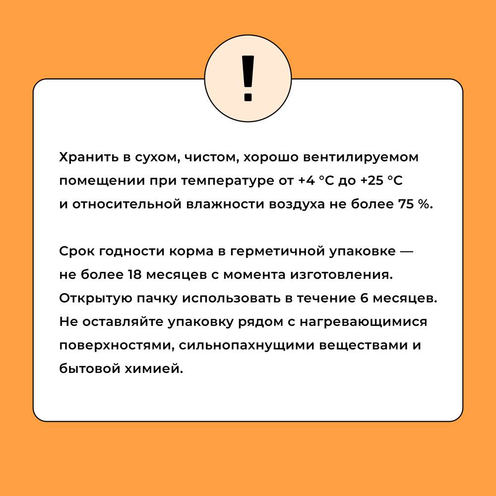 - Соответствие нормам по кормам FEDIAF, AAFCO, NRC и российскому ГОСТу Р 55453-2022