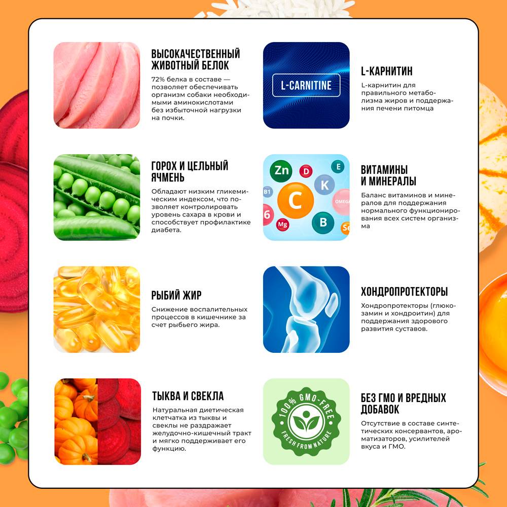 - 72% высококачественного животного белка в составе. Этот показатель рассчитан ветеринарными диетологами и позволяет обеспечивать организм собаки необходимыми аминокислотами без избыточной нагрузки на почки.
