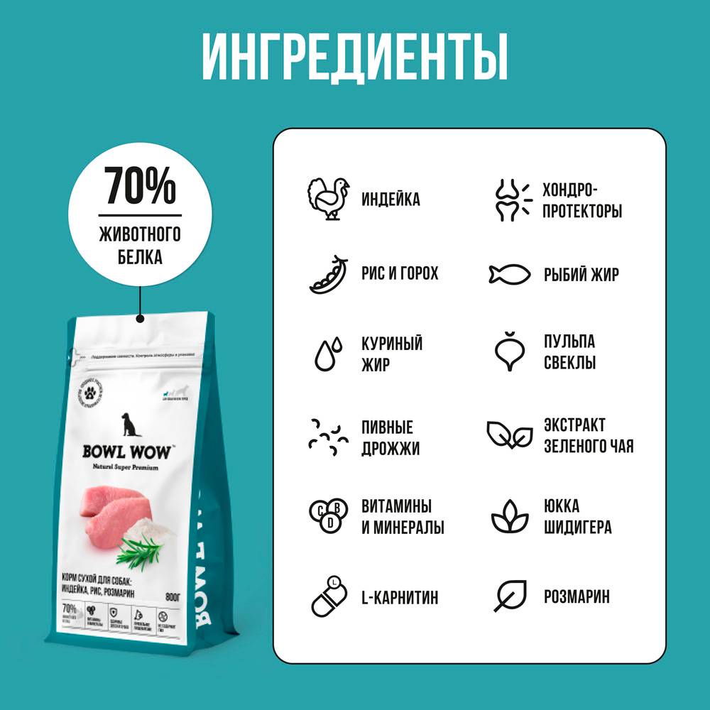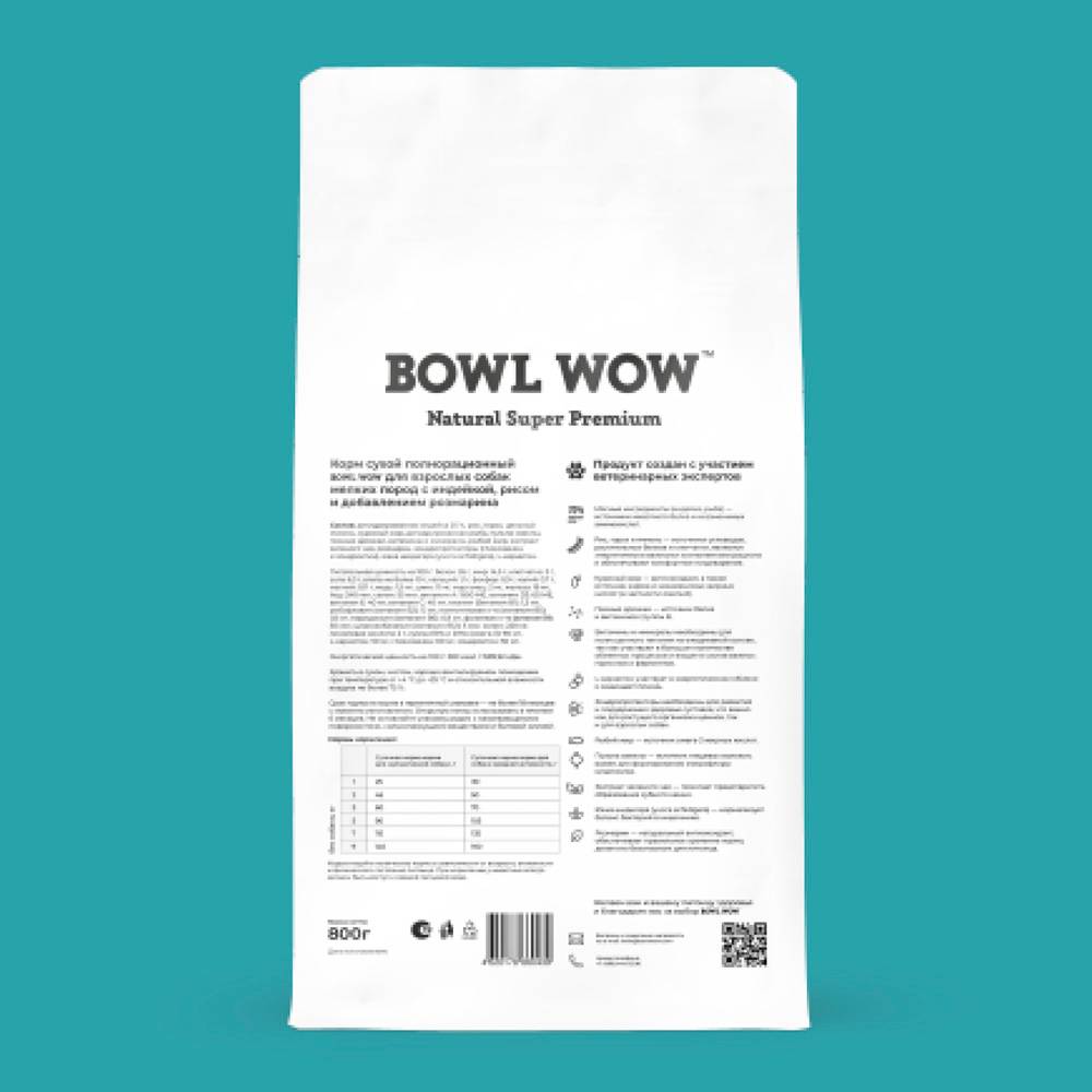 Полнорационный корм BOWL WOW с индейкой, рисом и розмарином разработан специально для собак мелких пород (весом до 10 кг). В его состав, помимо полного набора белков, жиров, углеводов, витаминов и микроэлементов, введены компоненты для заботы о здоровье десен и зубов и правильном пищеварении вашего питомца. Размер гранул 8–10 мм специально разработан для взрослых собак мелких пород.