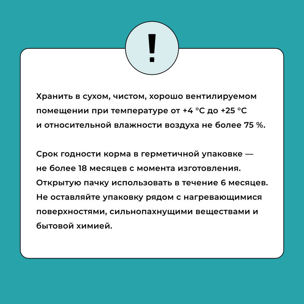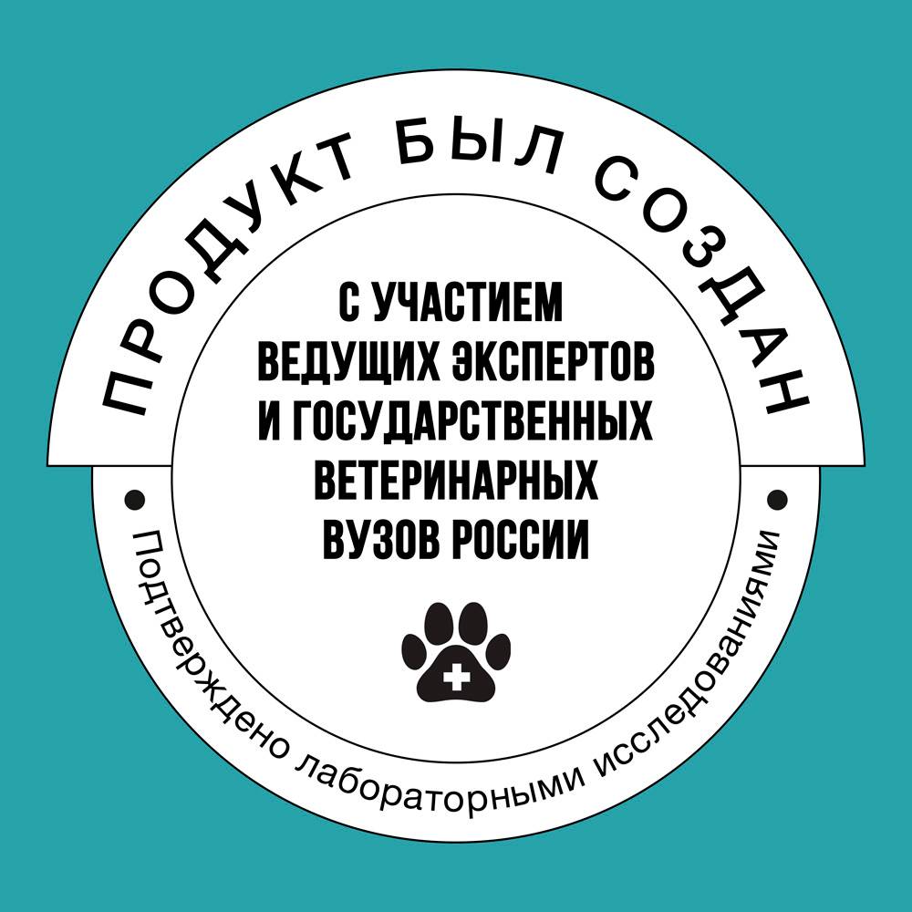 - Соответствие нормам по кормам FEDIAF, AAFCO, NRC и российскому ГОСТу Р 55453-2022.
