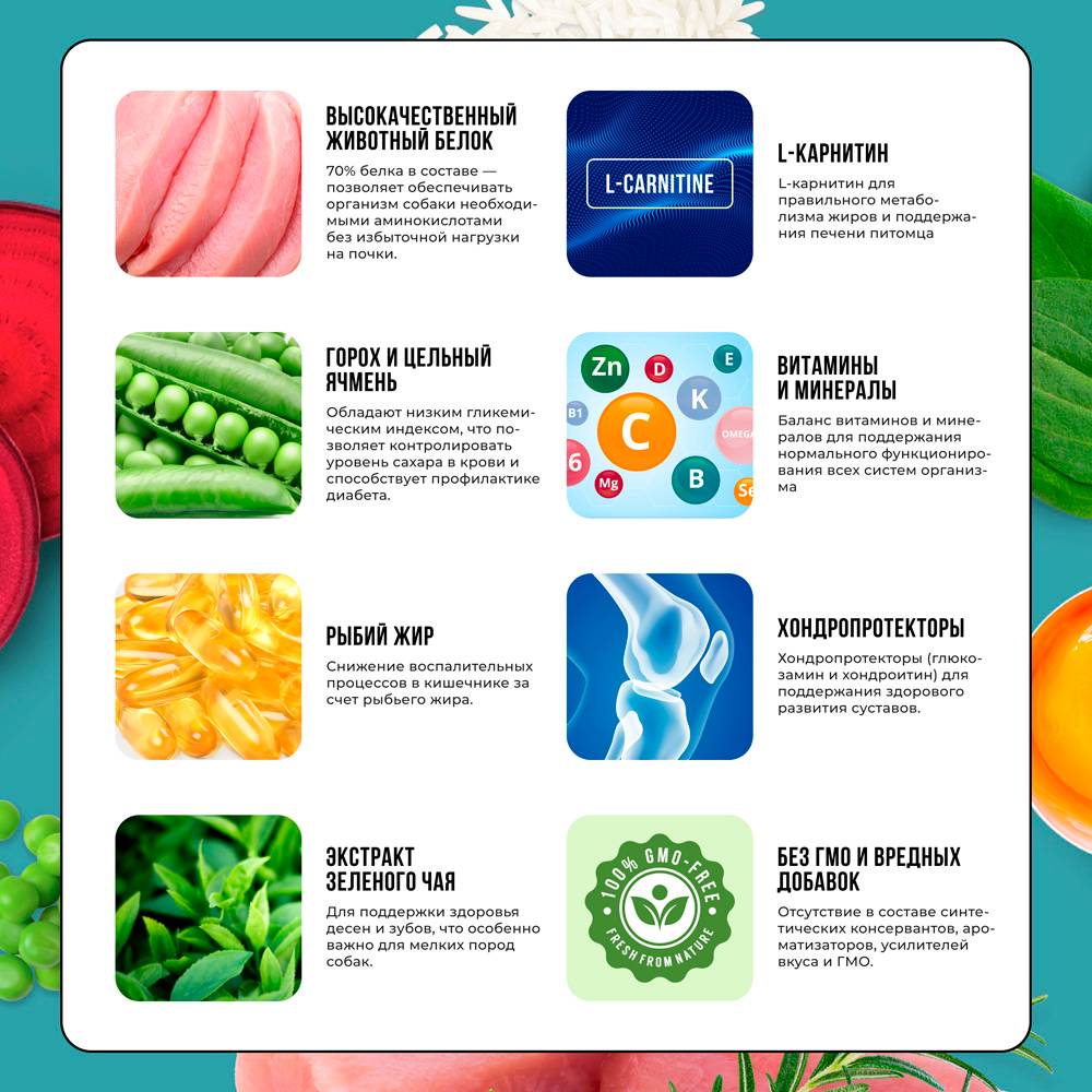 - Экстракт зеленого чая для поддержки здоровья десен и зубов, что особенно важно для мелких пород собак.