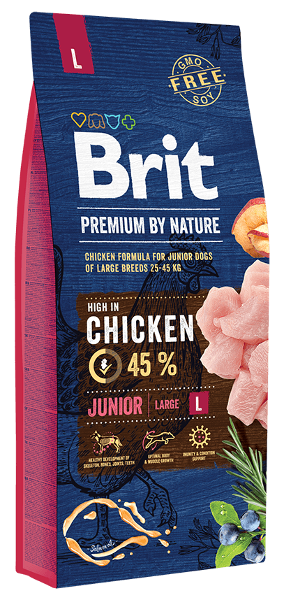 Полнорационный сухой корм Brit Premium by Nature Junior L для молодых собак (1–24 месяцев) крупных пород (25–45 кг).