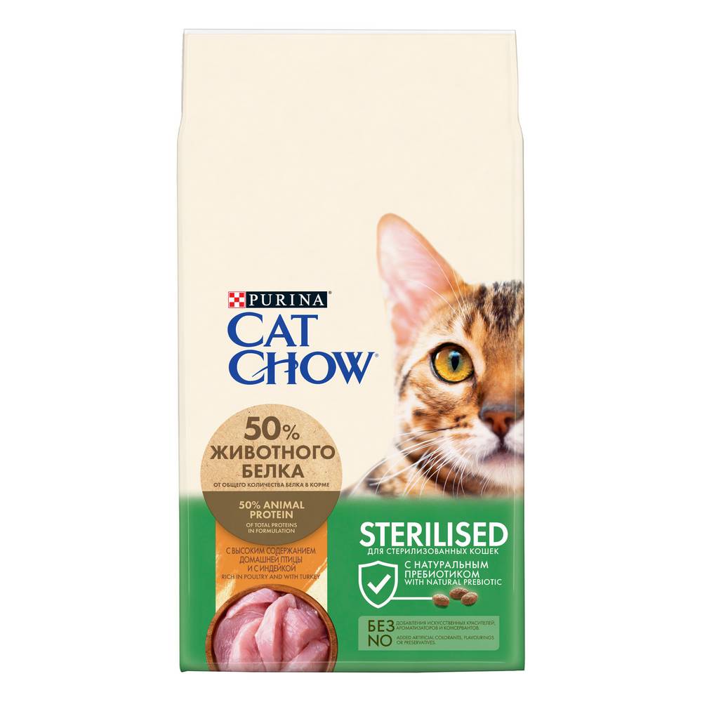 - Сухой корм для кошек Cat Chow Sterilised — полнорационный, содержит все необходимые для здоровья микронутриенты.