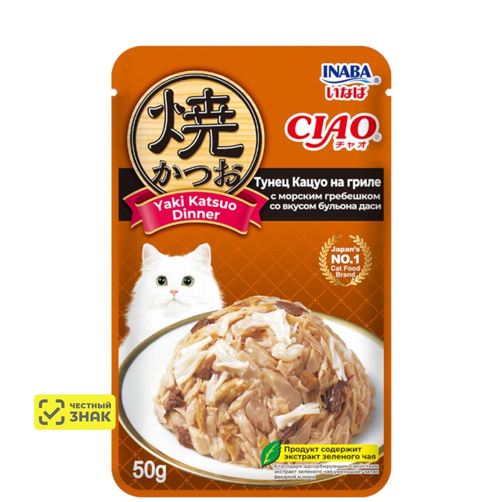 INABA CIAO Yaki Katsuo Dinner Влажный корм (пауч) для кошек, тунец кацуо на гриле с морским гребешком со вкусом бульона даси, 50 гр.
