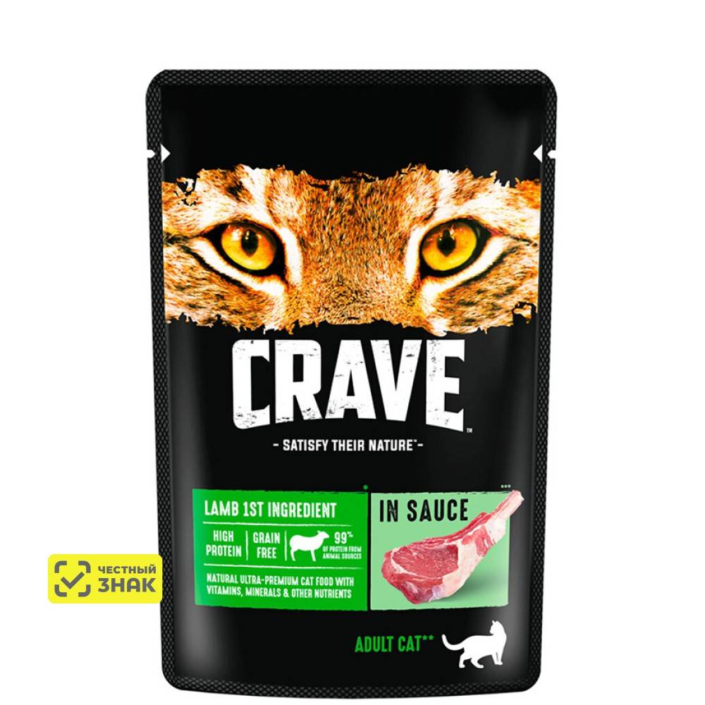 Crave Влажный корм (пауч) для взрослых кошек, с ягненком в соусе, 70 гр.