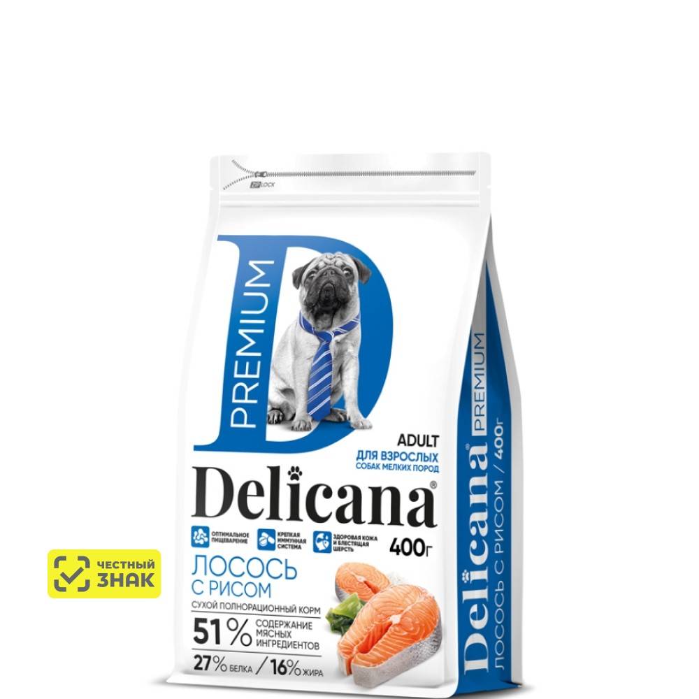 DELICANA Premium Сухой корм для собак мелких пород, лосось с рисом, 400 гр.