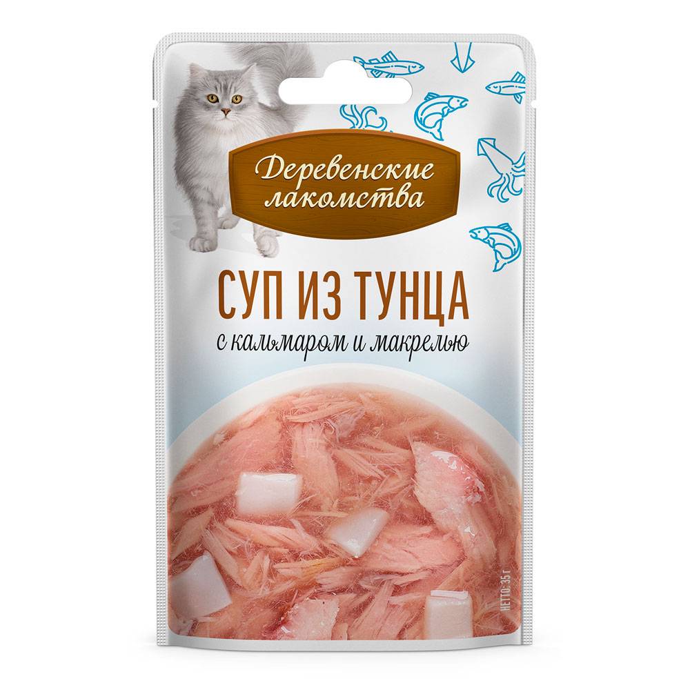 Густой аппетитный бульон с нежнейшим тунцом, кальмаром и макрелью — превосходное угощение для кошек. Лакомство можно давать как отдельное блюдо или использовать как подливку для сухих кормов.