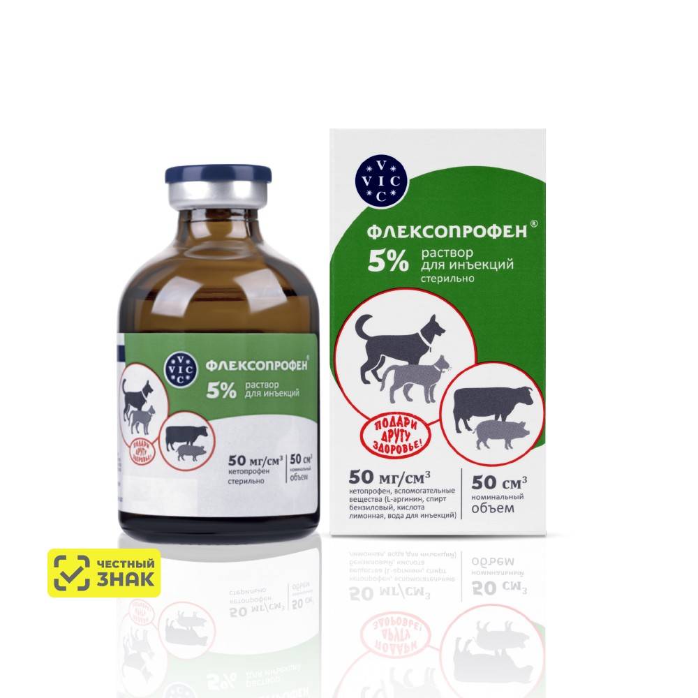 Флексопрофен 5% р-р для инъекций - Кетопрофен, входящий в состав ФЛЕКСОПРОФЕНА®, обладает противовоспалительным, обезболивающим и жаропонижающим действием, эффективен для лечения острых, подострых и хронических воспалений, сопровождающихся симптомом боли. Кетопрофен уменьшает агрегацию тромбоцитов, транзиторное повышение уровня ферментов печени. Механизм действия препарата заключается в подавлении синтеза простогландинов путем нарушения метаболизма арахидоновой кислоты. При внутримышечном введении максимальная концентрация кетопрофена в плазме крови отмечается через 30 минут. Биодоступность препарата варьирует от 85% до 100%. Кетопрофен из организма выводится преимущественно через почки. Применяют лошадям: внутривенно в дозе 2,2 мг/кг массы животного (4,4 мл/100 кг 5%-раствора), 1 раз в день, в течение 1-5 дней. Противопоказанием к применению ФЛЕКСОПРОФЕНА® является индивидуальная повышенная чувствительность к кетопрофену и другим компонентам препарата, язва желудка и 12-перстной кишки, геморрагический синдром, выраженная печеночная и почечная недостаточность, беременность.