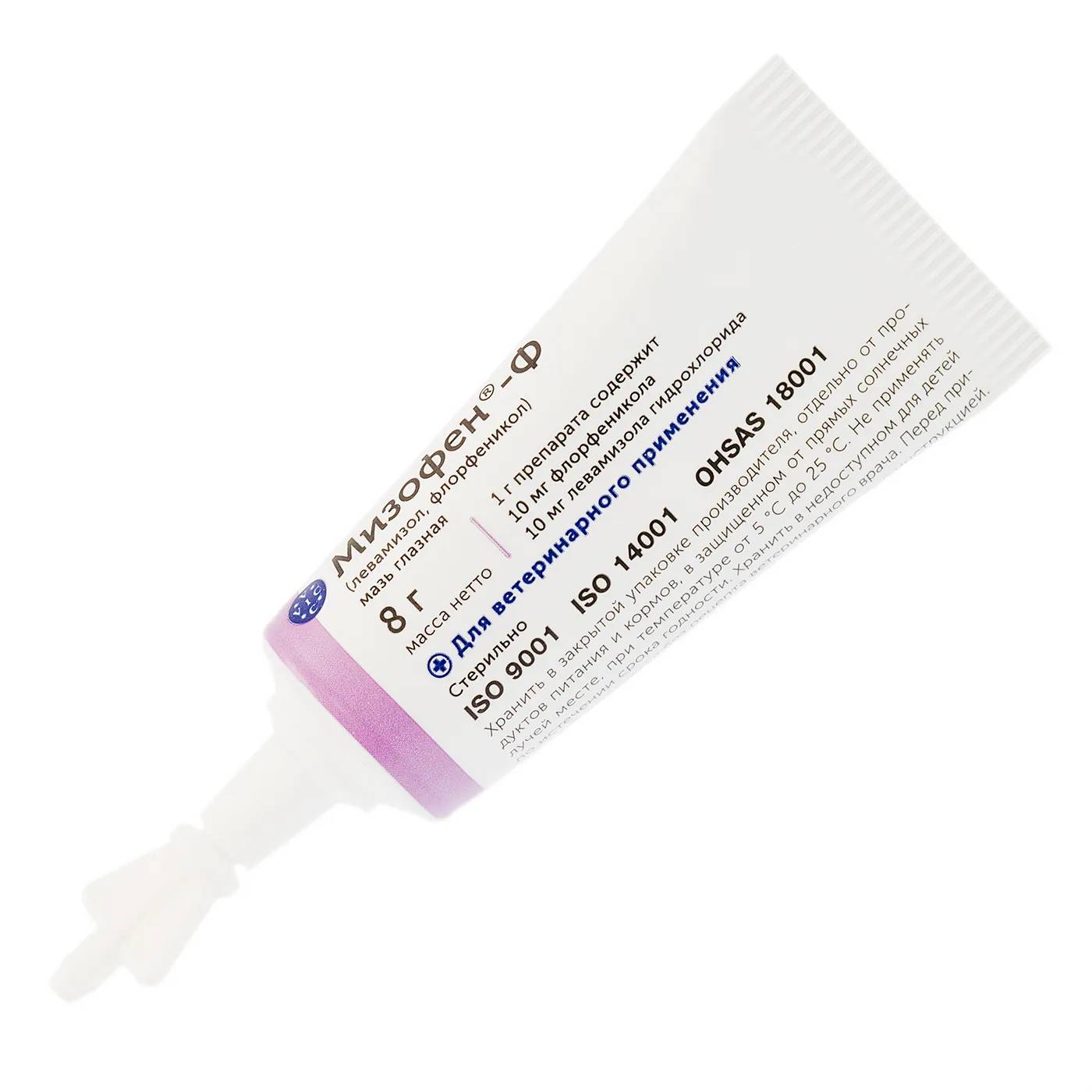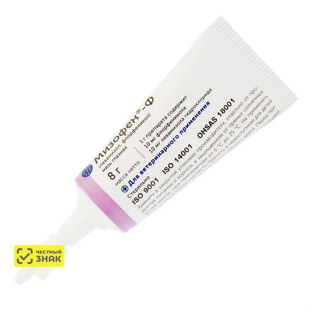 МИЗОФЕН®-Ф (Флорфеникол, левамизол). Мазь для лечения бактериальных и паразитарных конъюнктивитов и инфицированных ран, ожогов, обморожений, используется при дренировании гнойных ран и лечения поражений слизистых оболочек любой этиологии. Флорфеникол подавляет развитие раневой инфекции, снижает воспалительный процесс в тканях кожи. Левамизол стимулирует механизмы регенерации поврежденных тканей, обладает антипаразитарным действием в отношении нематод, снижает интенсивность инфекционного процесса.
