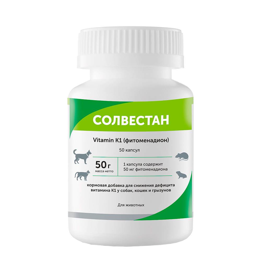 СОЛВЕСТАН (ВИТАМИН К1_фитоменадион) Нормализует метаболизм и повышает свертываемость крови; останавливает кровотечения, в т. ч. внутренние. Антидот при отравлении зоокумаринами и другими антикоагулянтами, предотвращает гибель животного от кровопотери и внутренних кровоизлияний.