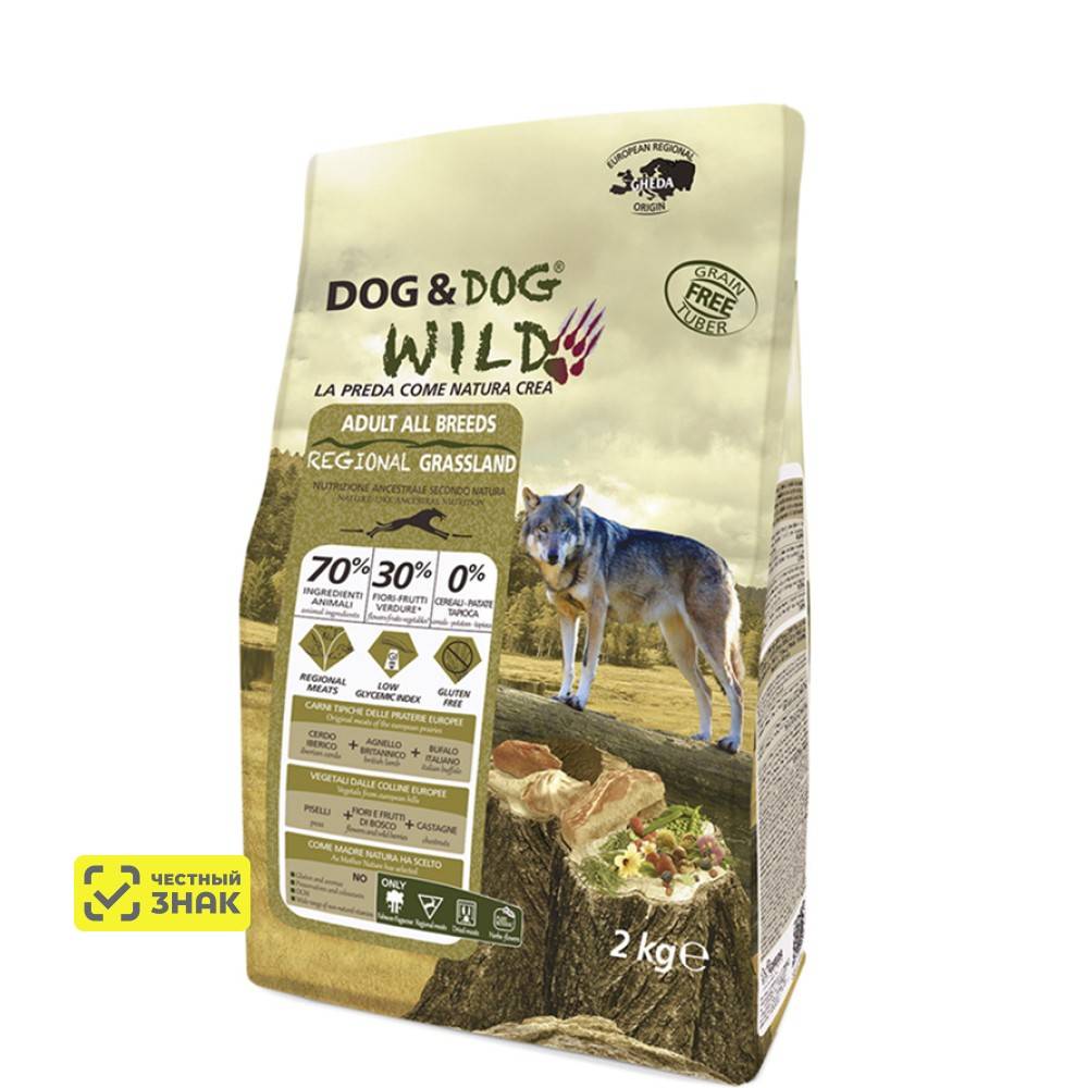 Dog & Dog WILD – линейка кормов, разработанная с учетом потребностей собак, заложенных природой. Через формулу 70%/30%/0%* корм предлагает такое же богатство и разнообразие мяса и рыбы, которые ежедневно дает природа, а также овощи, растения, ягоды и фрукты, за исключением таких компонентов, как злаки и растительные белки, которые не входят в естественный рацион собак.