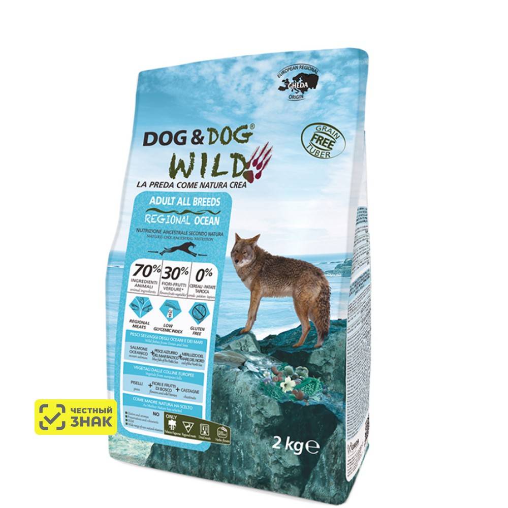 Dog & Dog WILD – линейка кормов, разработанная с учетом потребностей собак, заложенных природой. Через формулу 70%/30%/0%* корм предлагает такое же богатство и разнообразие мяса и рыбы, которые ежедневно дает природа, а также овощи, растения, ягоды и фрукты, за исключением таких компонентов, как злаки и растительные белки, которые не входят в естественный рацион собак.
