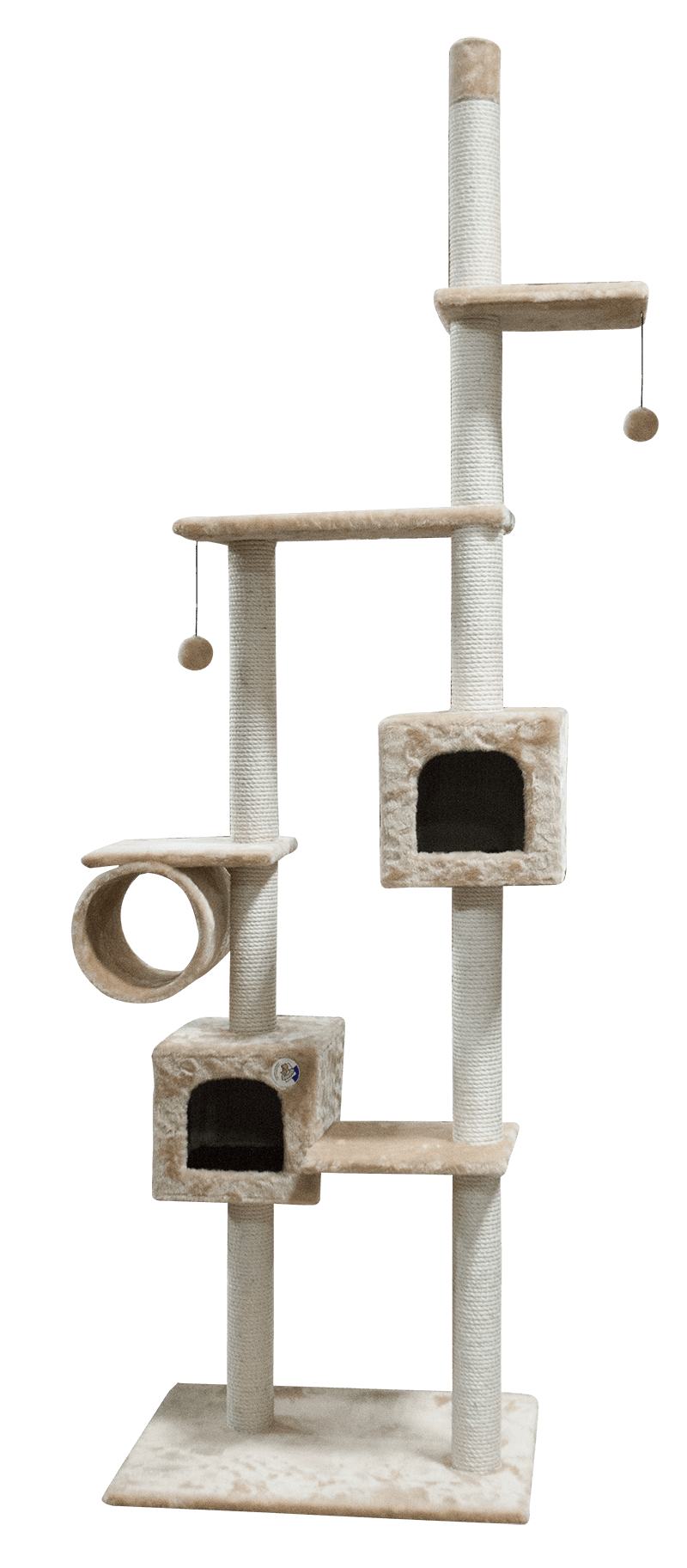 Домоседы Дом-когтеточка для кошек многоярусный с двумя домиками и подвесными игрушками, крепление к потолку, бежевый, 55х113х270 см