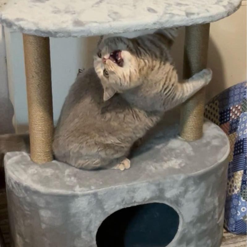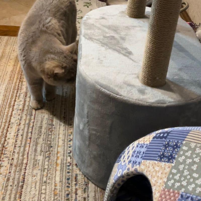 - В домике есть место для отдыха и когтеточка.