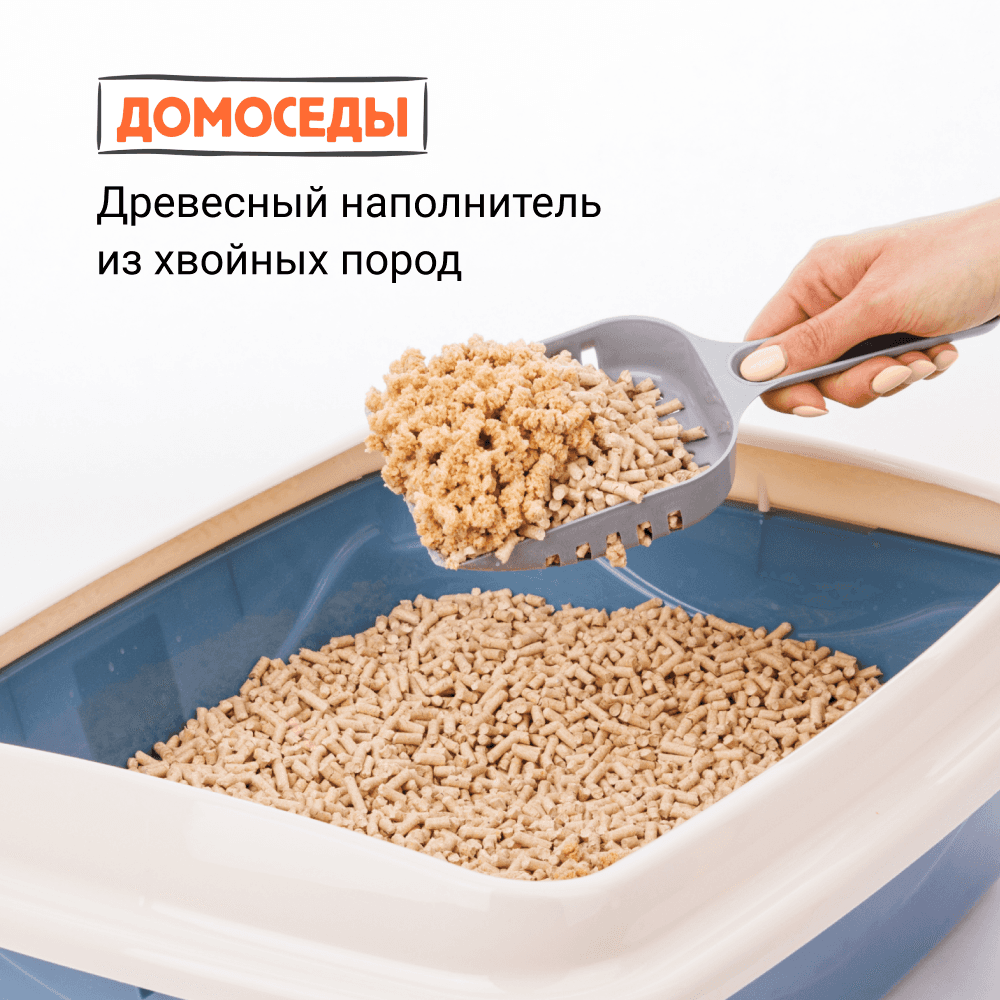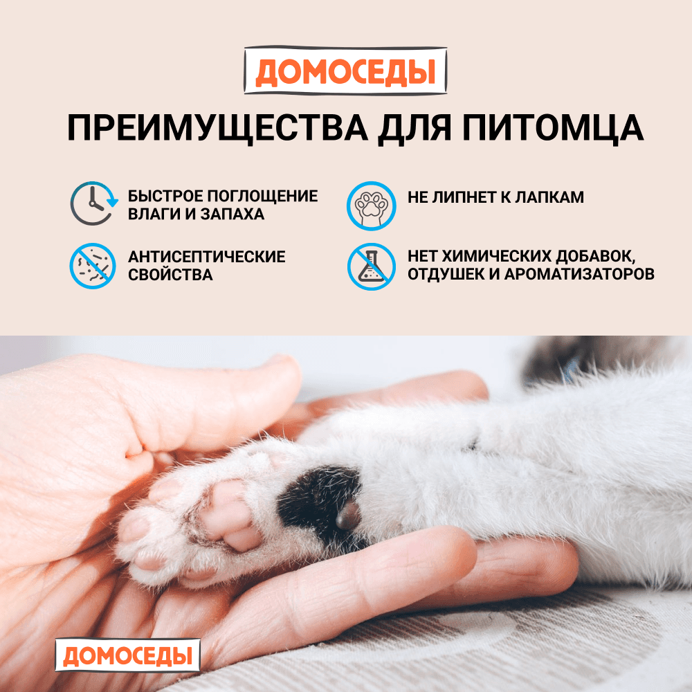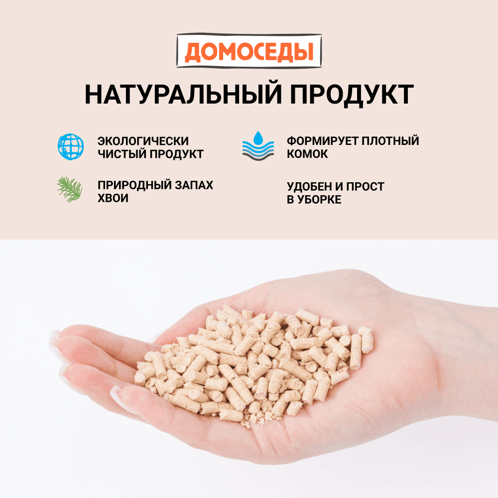 Древесный гранулированный наполнитель ДОМОСЕДЫ – это 100% экологически чистый продукт, который не прилипает к лапкам и шерсти и прост в уборке, отлично поглощает влагу и впитывает до 200% своего веса (4кг/10л наполнителя впитывают до 20 л. влаги). Наполнитель не прилипает к шерсти и лапкам кошек благодаря плотной грануле. При этом не содержит агрессивных компонентов и является 100% натуральным и экологически чистым продуктом.