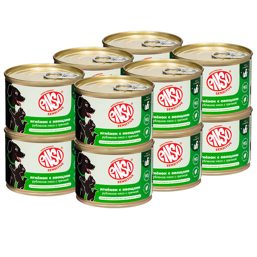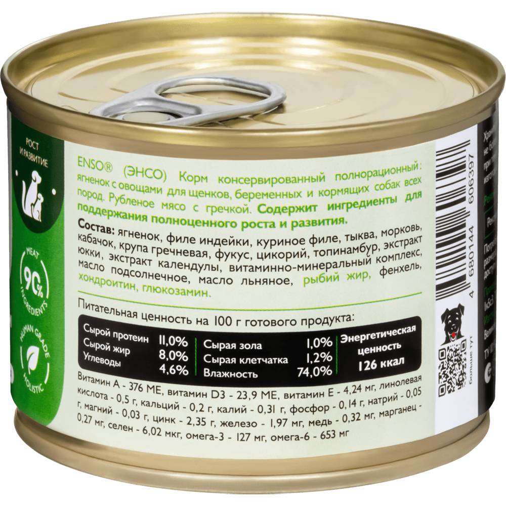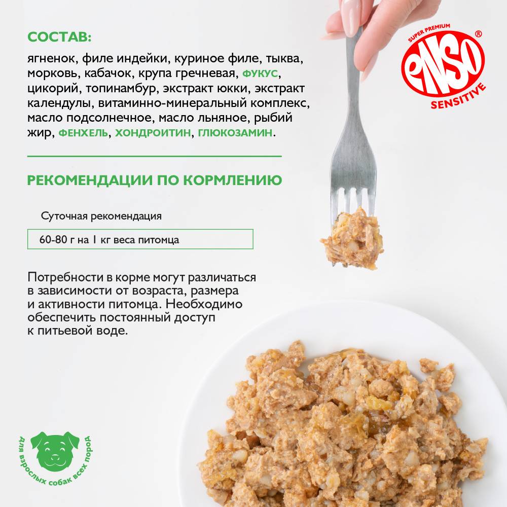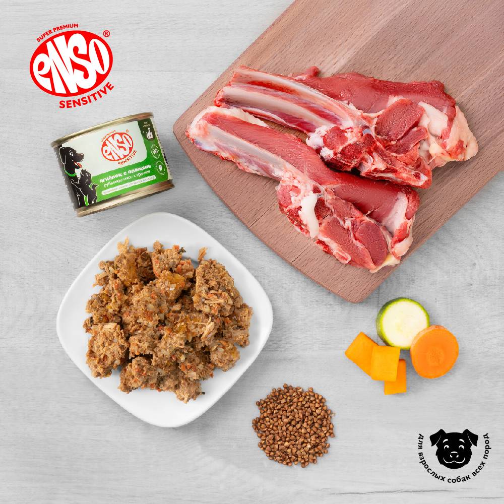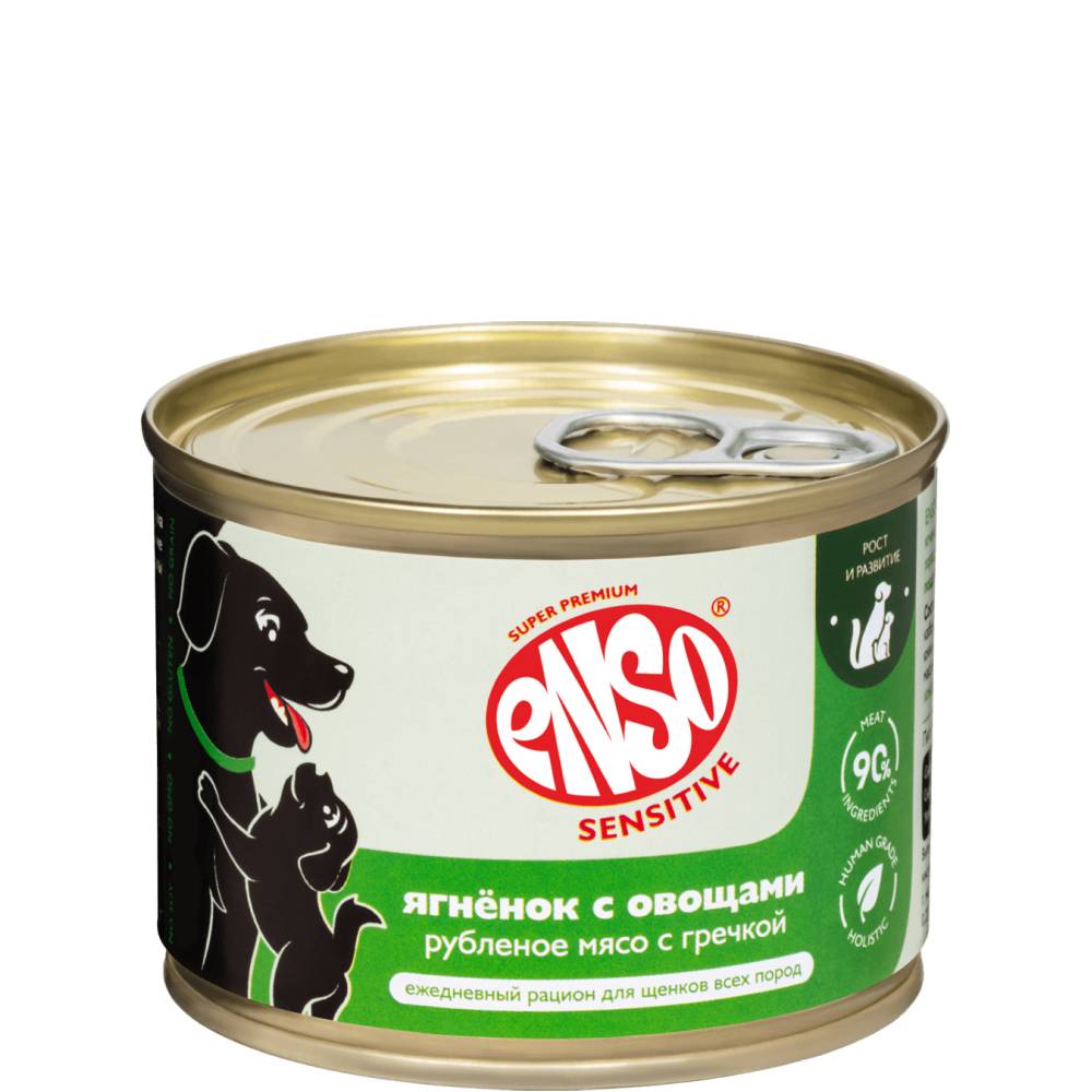 ENSO SENSITIVE Полнорационный влажный корм для поддержания активного роста и развития щенков ягненок с овощами. Рубленое мясо с гречкой.
