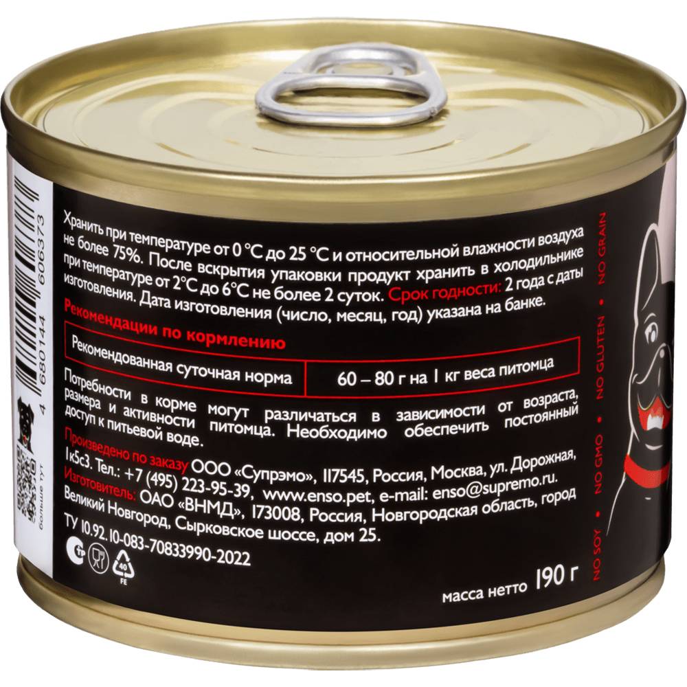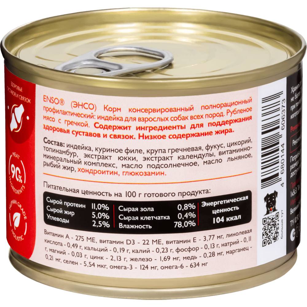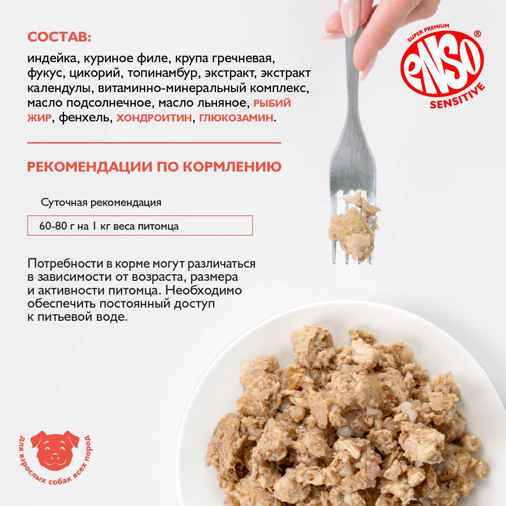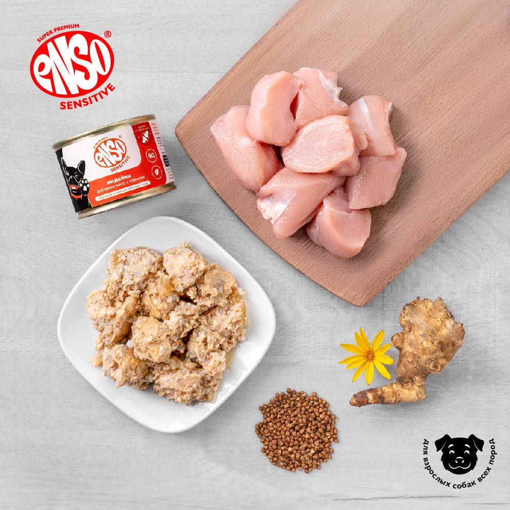 ENSO SENSITIVE Полнорационный влажный корм для поддержания здоровья суставов и связок взрослых собак индейка. Рубленое мясо с гречкой.