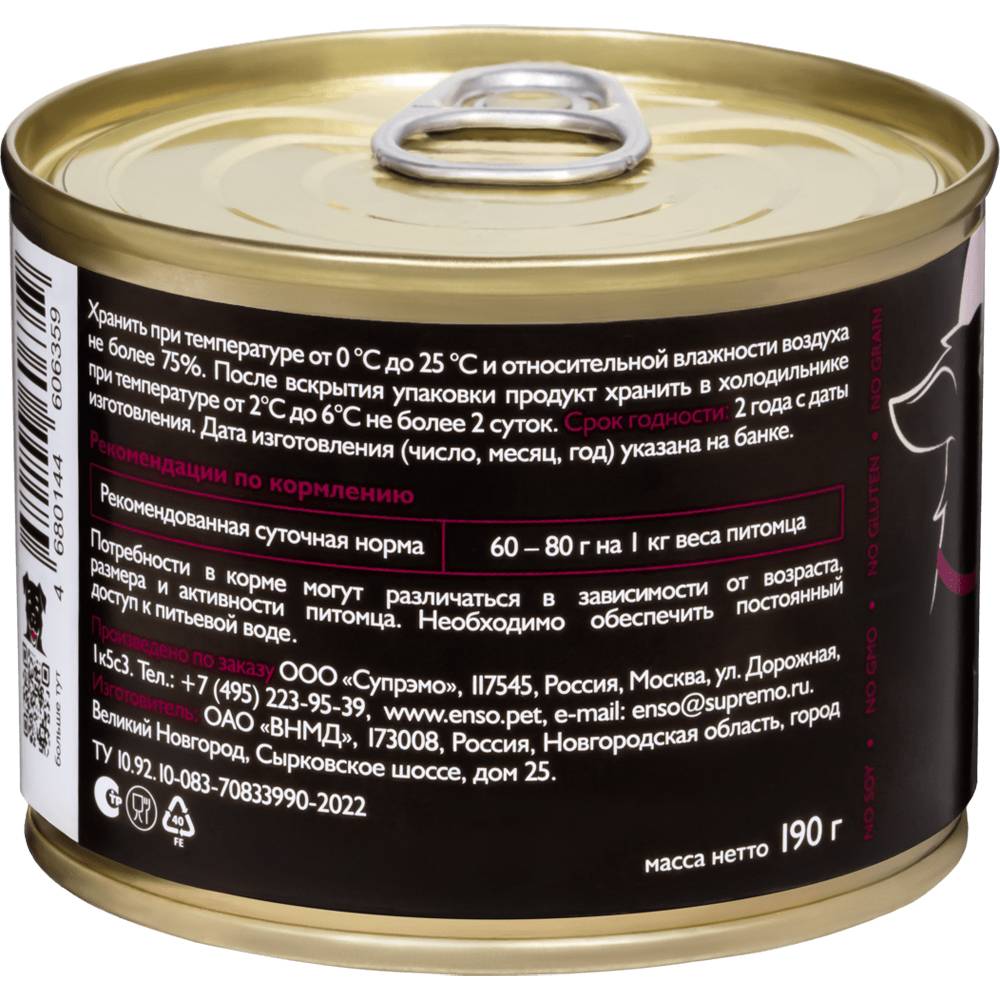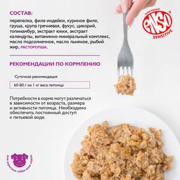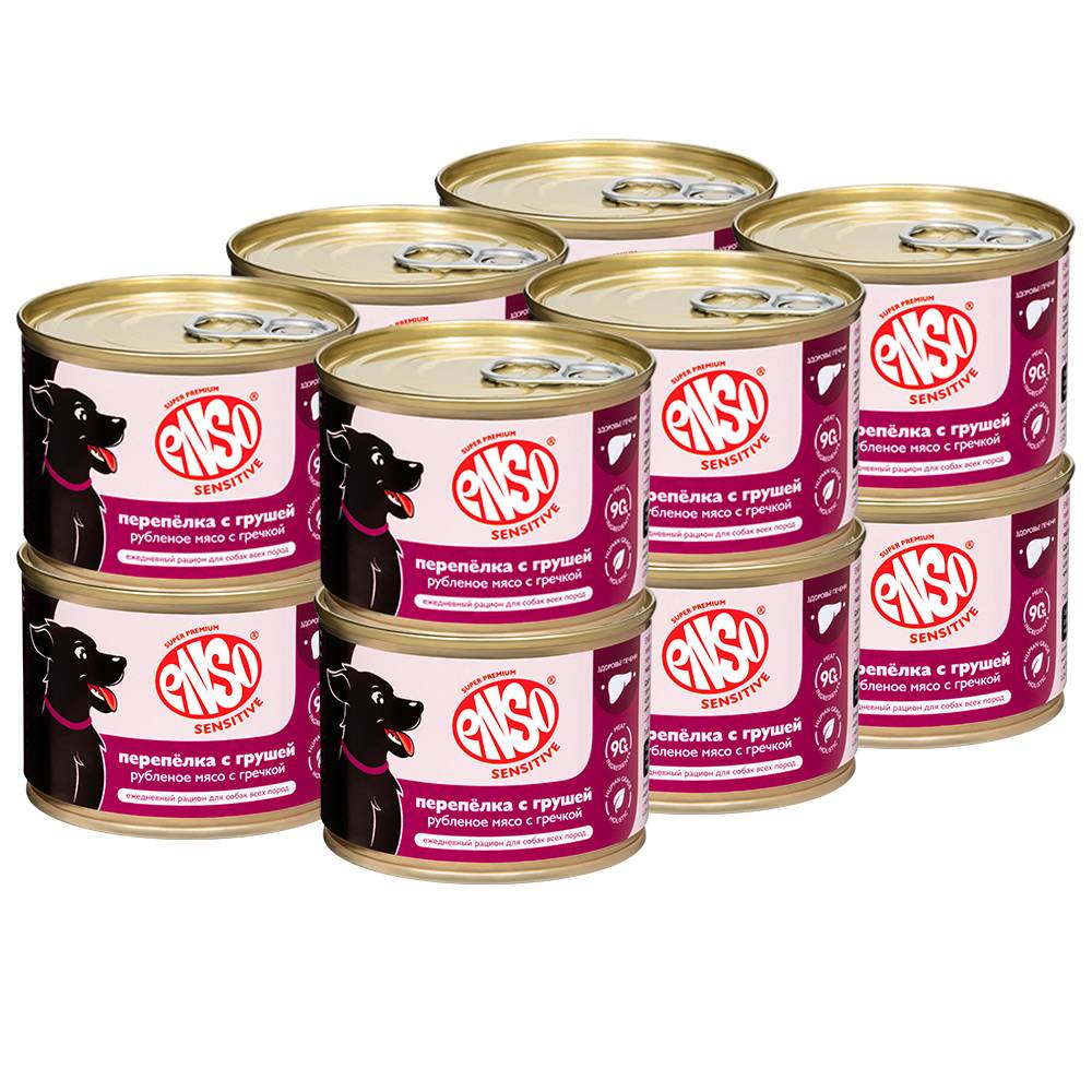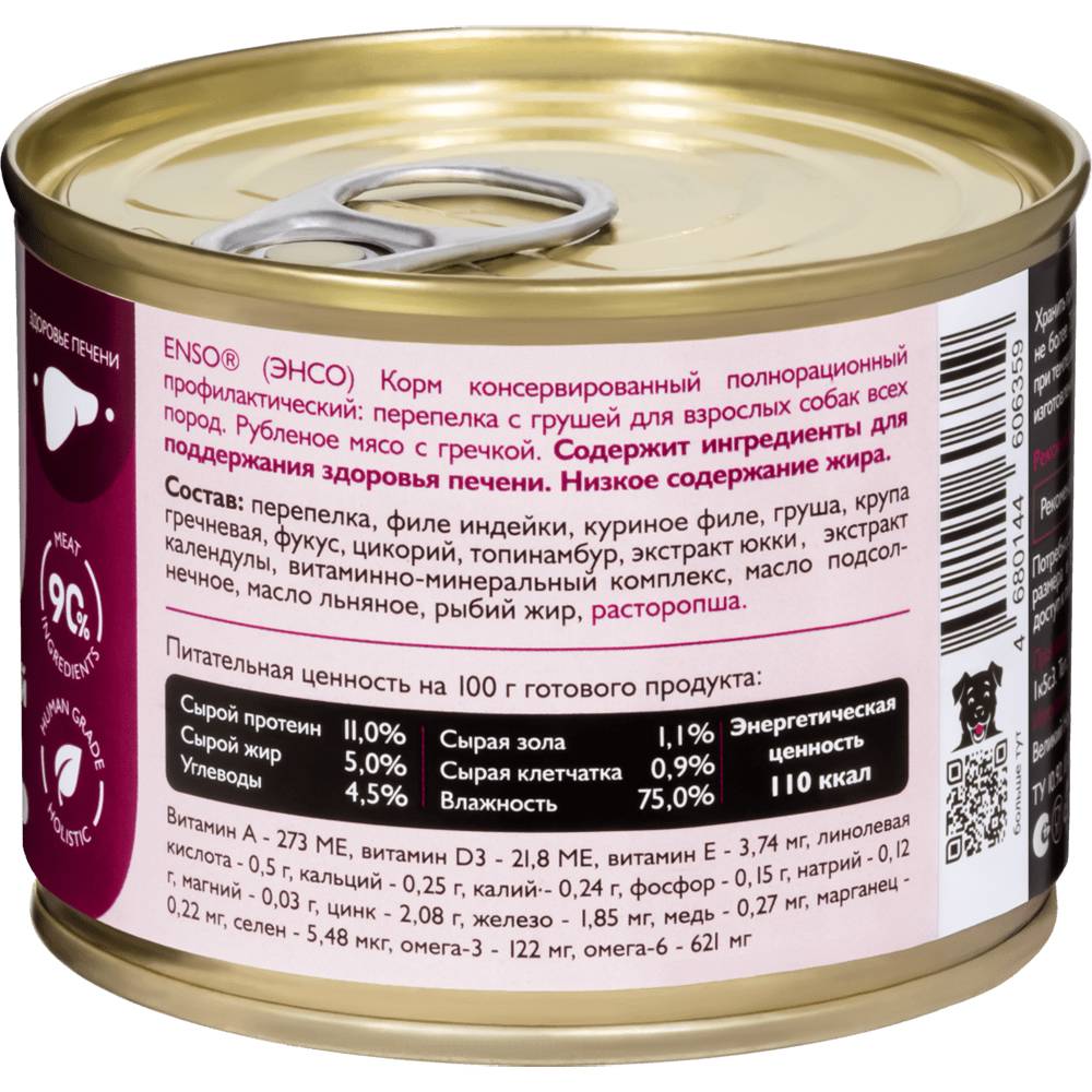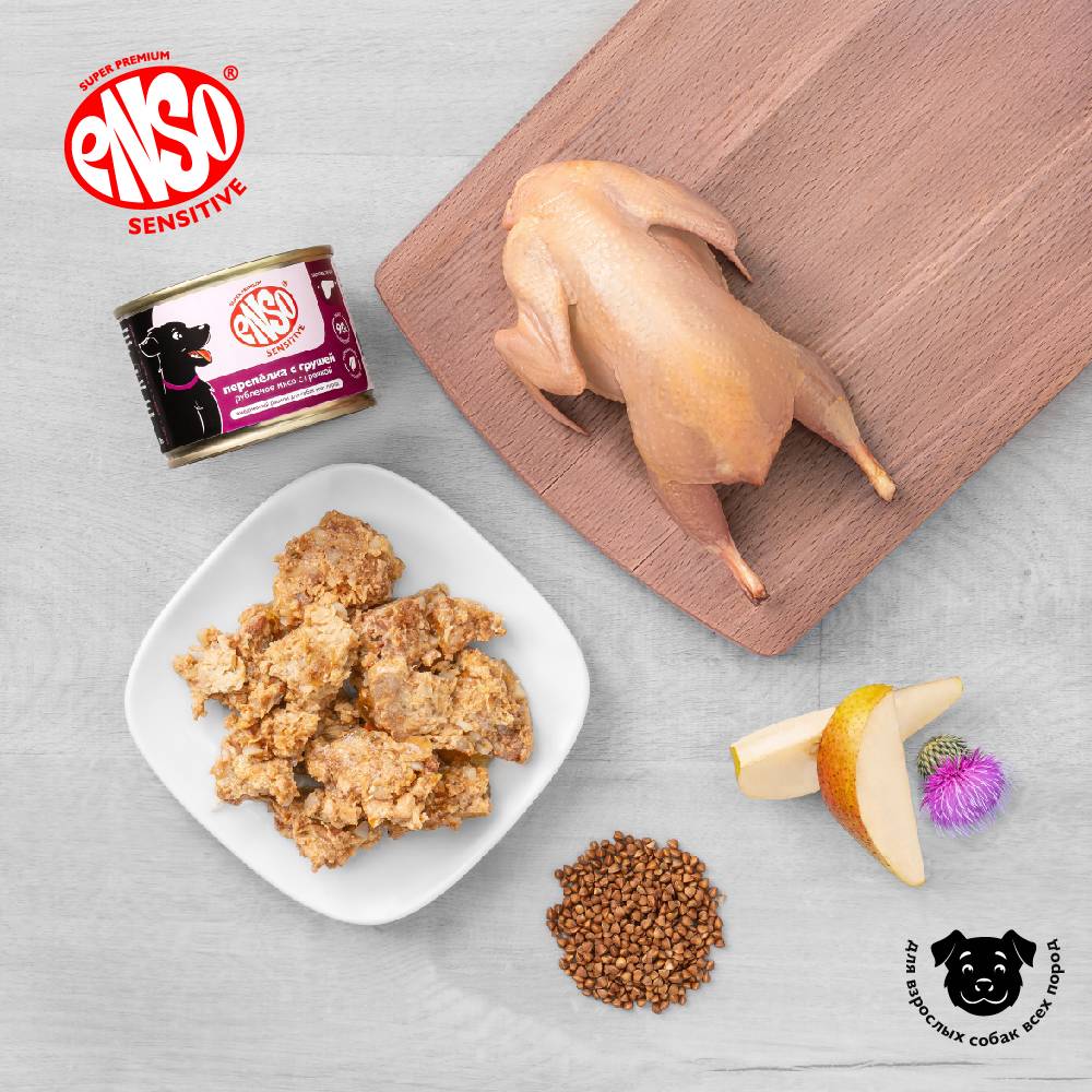 ENSO SENSITIVE Полнорационный влажный корм для поддержания здоровья печени взрослых собак перепелка с грушей. Рубленое мясо с гречкой.