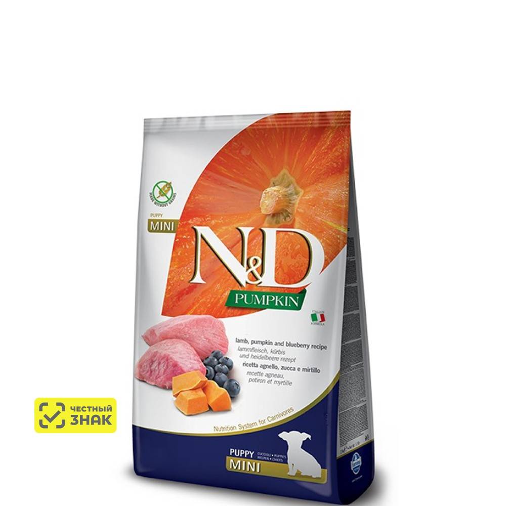 Корм для собак Фармина Ягненок, тыква, черника. Полнорационное питание для щенков, беременных и кормящих собак.
