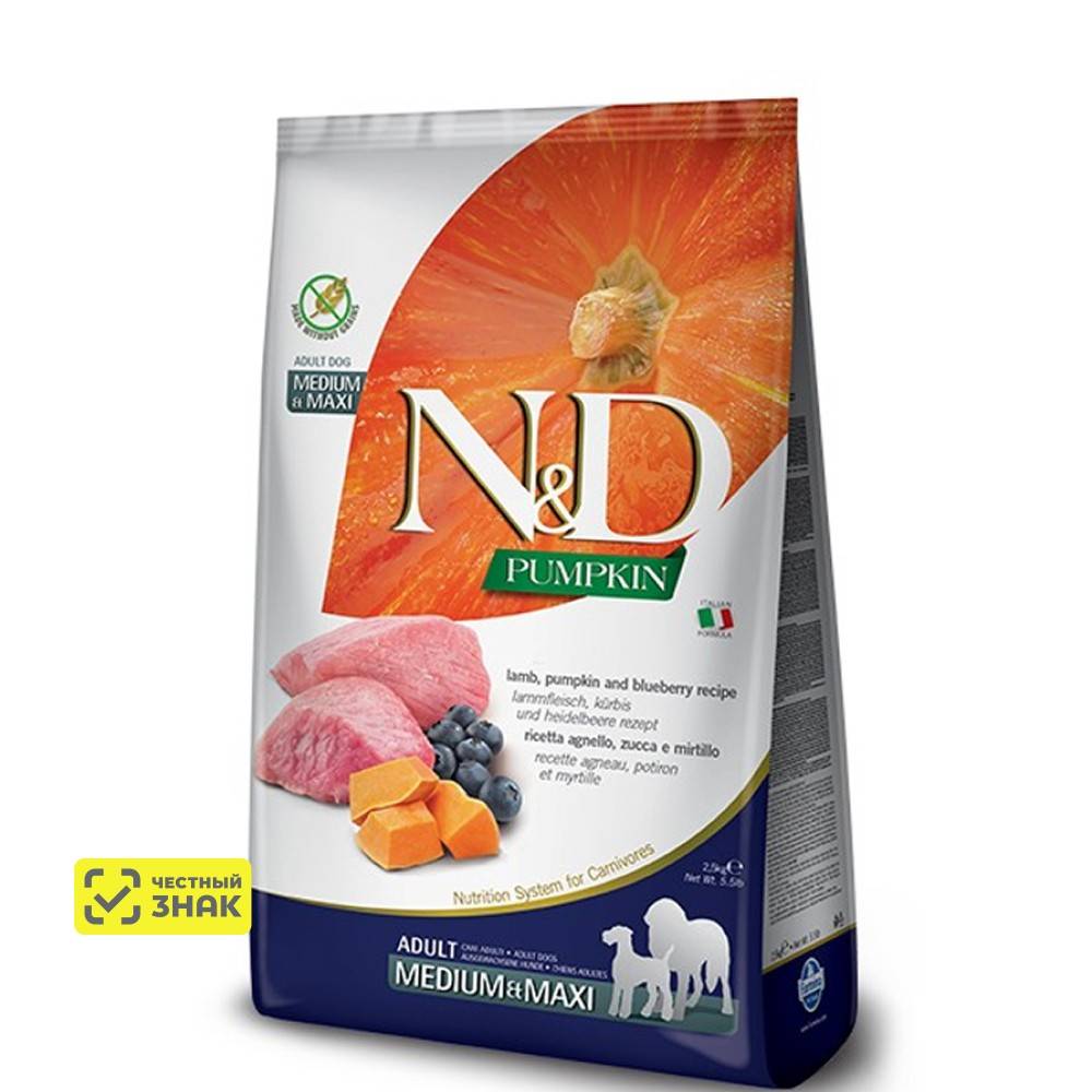 Полнорационный беззерновой сухой корм для взрослых собак Фармина Ягненок, тыква и черника.
