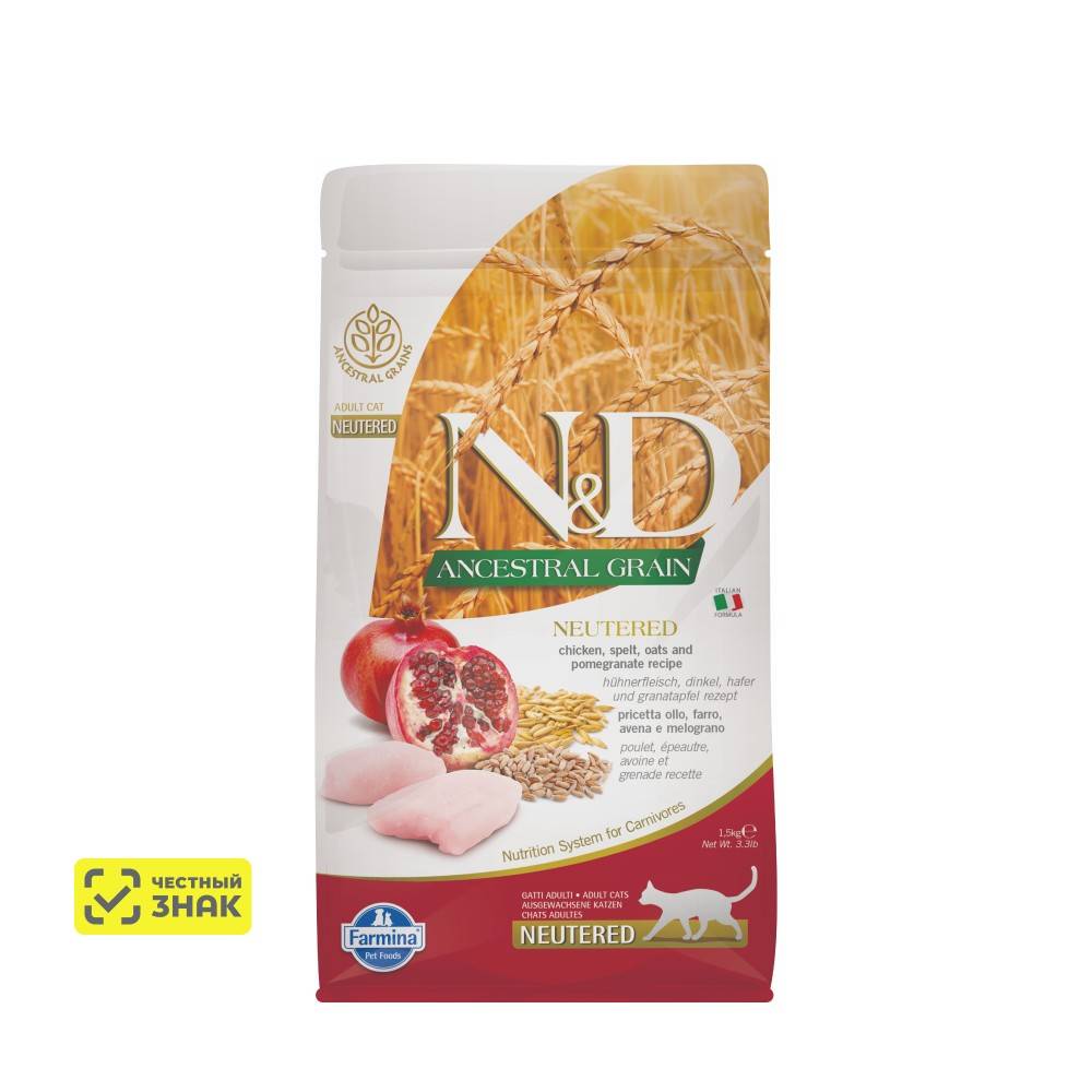 Farmina ND Ancestral Grain Сухой корм для стерилизованных кошек и кастрированных котов, курица, спельта, овес и гранат, 1,5 кг