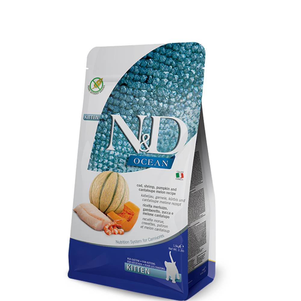 Полнорационный сухой корм Farmina Ocean на основе трески с добавлением креветок, тыквы и дыни специально разработан для котят и содержит более 60% рыбных ингредиентов.