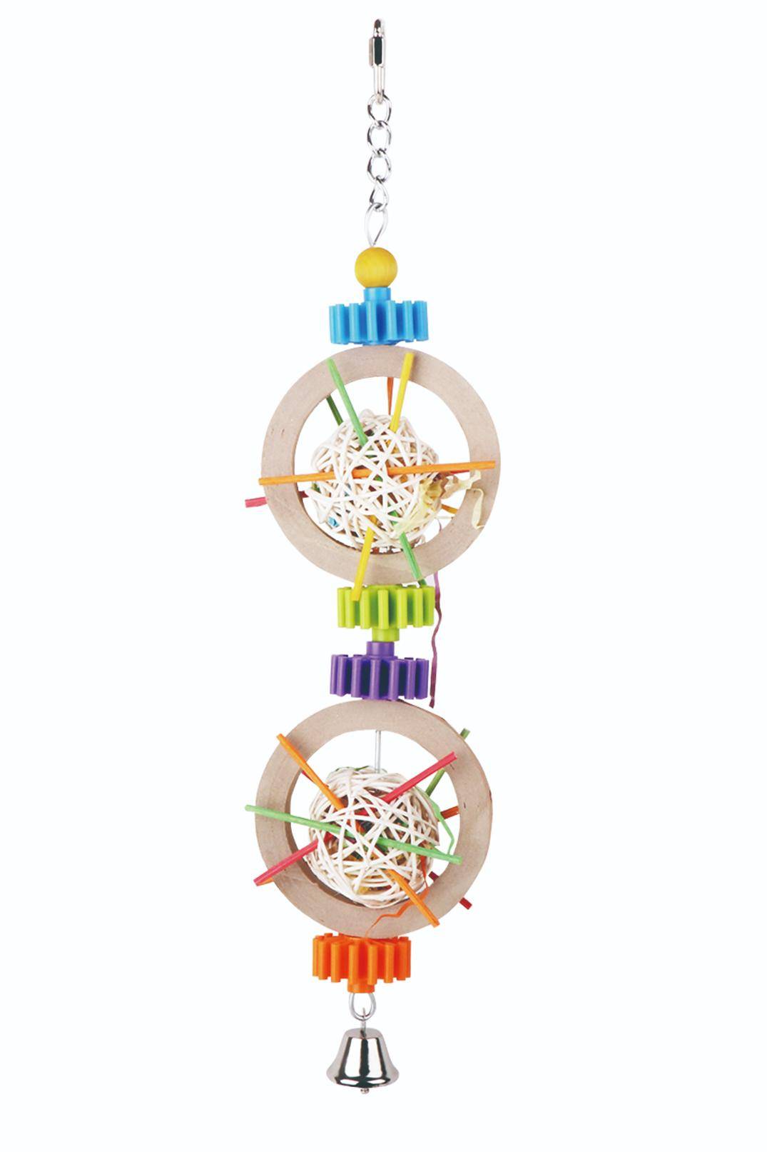 Игрушка для птиц Кольца с плетеными мячами. Дополнена яркими деталями из пластика. Преимущества: Подвесная игрушка для птиц из натуральных материалов. С колокольчиком. Яркие декоративные элементы. Игрушки необходимы для птиц, чтобы они не скучали в ваше отсутствие. Длинная игрушка подойдет для клеток большого объема.