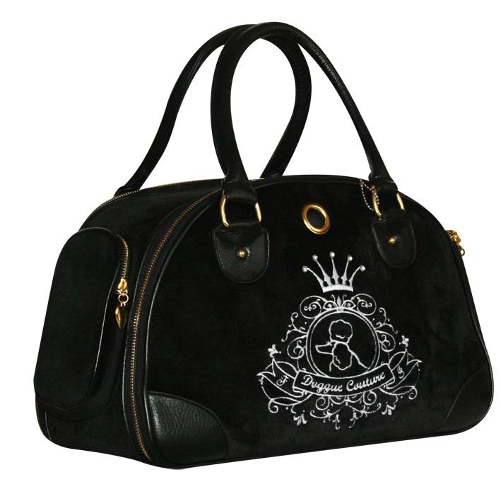 - Сумка-переноска из черной ткани с вышивкой и стразами.