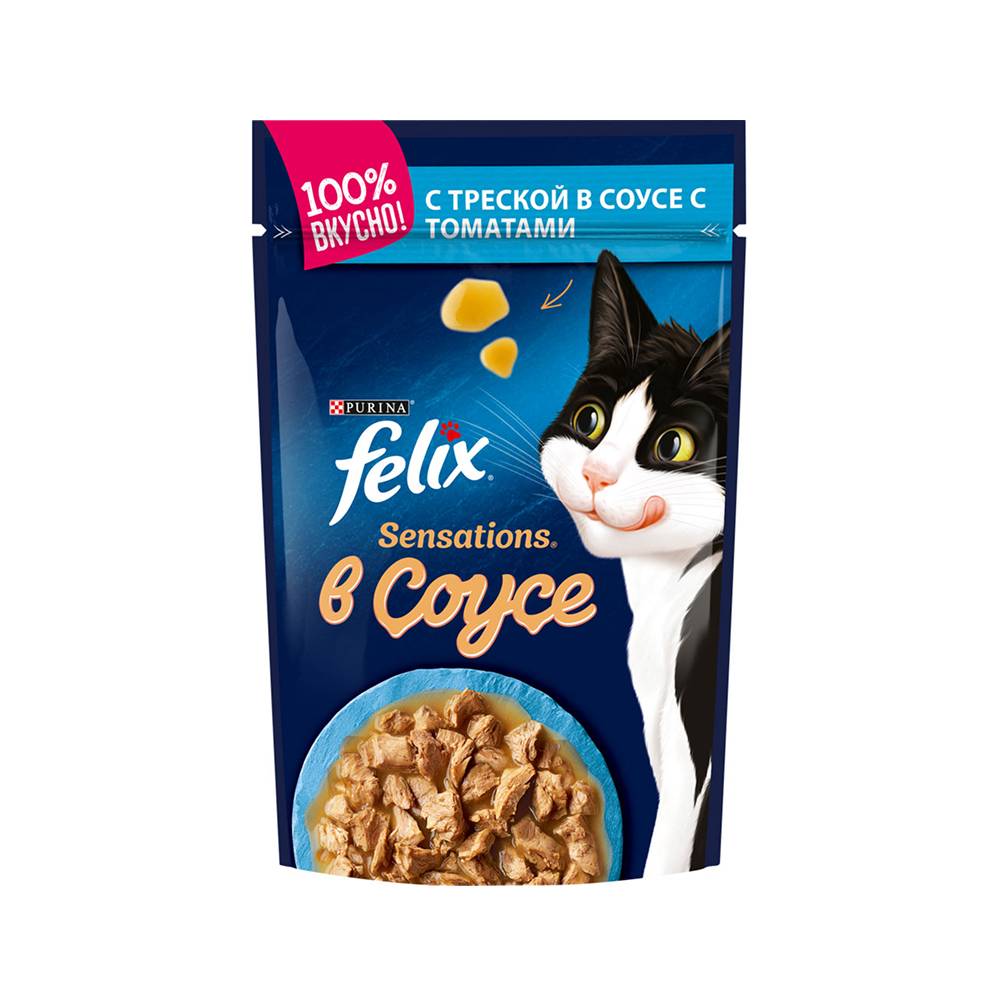 Felix Sensations Влажный корм (пауч) для взрослых кошек, с треской в соусе, 85 гр.