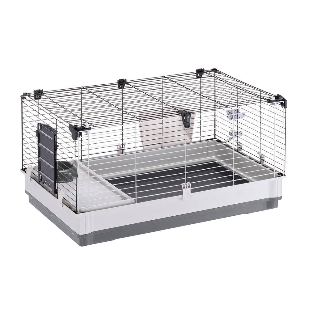 Клетки Krolik для кроликов и морских свинок выпускаются в двух различных размерах и цветовых вариантах. Они изготовлены из окрашенной металлической решетки и оснащены удобной передней дверцей, которую можно открыть, чтобы иметь свободный доступ внутрь клетки при ежедневном обслуживании и уборке. Для более тщательной чистки можно быстро отделить решетку от поддона: просто отщелкните фиксирующие замки, специально разработанные для предотвращения их разблокировки грызуном и случайного побега животного из клетки.