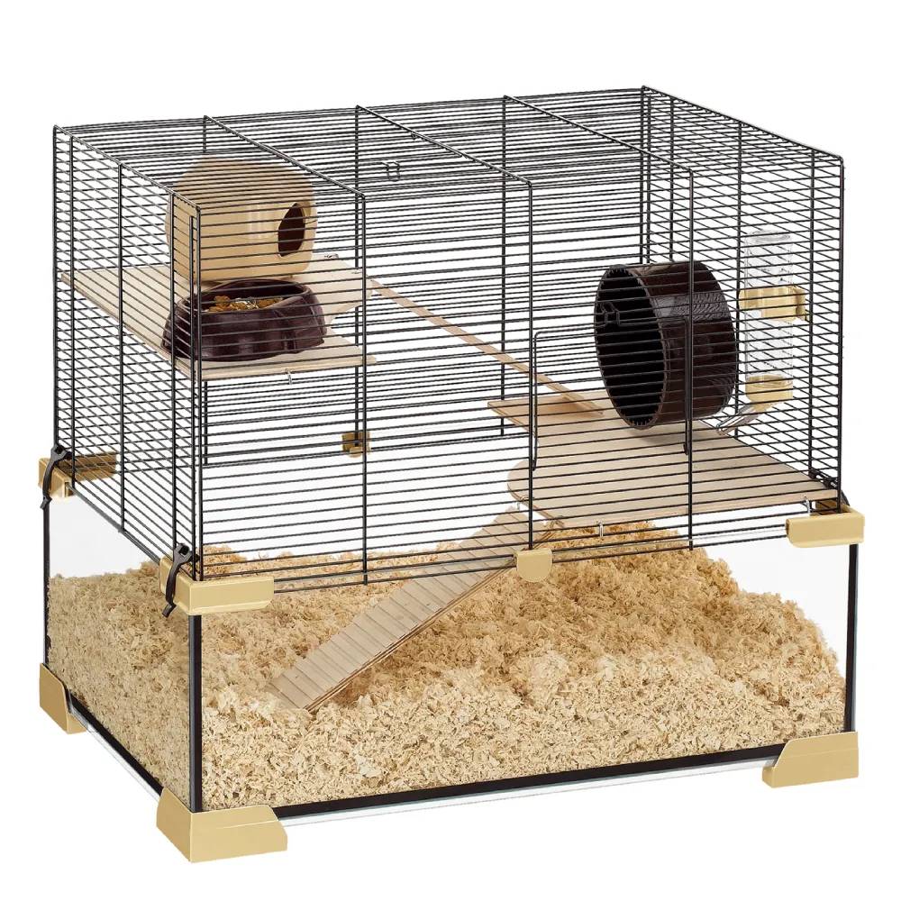 Karat выпускается трех размеров, из которых вы можете выбрать наиболее подходящий вашему питомцу. Все модели идут в комплекте с аксессуарами, среди которых домик для сна, миска, поилка и колесо. В упаковке вы также найдете 4 пластиковые ножки для максимальной устойчивости клетки. Для удобного ухода за клеткой верхнюю часть можно полностью снять; небольшие дверки спереди и сверху облегчают ежедневную уборку.