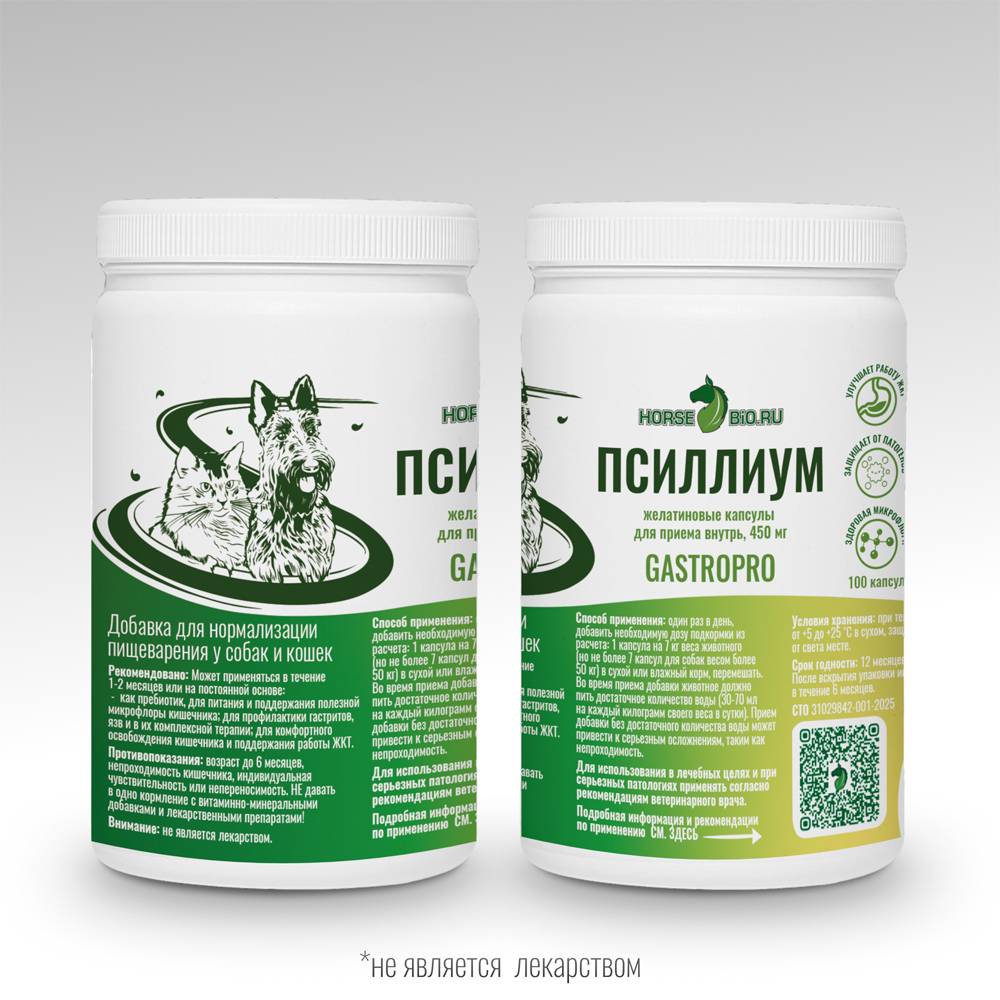 Псиллиум — натуральная клетчатка для поддержки ЖКТ из шелухи семян подорожника. Формат желатиновых капсул 450 мг упрощает ежедневный прием у кошек и собак мелких пород.