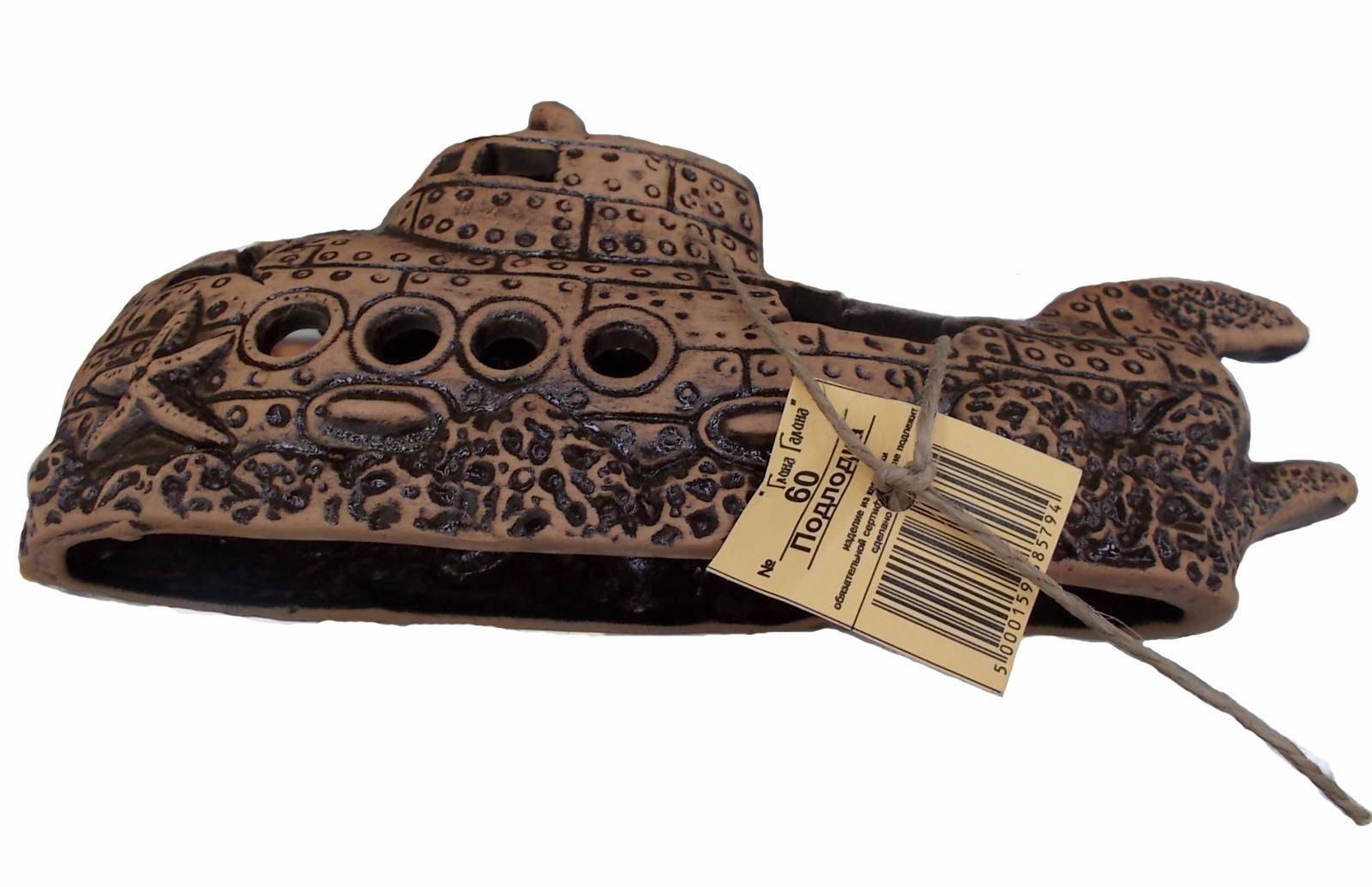 Подлодка сделана из глины и подойдет для любого типа аквариумов. Детально продуманная, тщательно разработанная и выполненная исключительно качественно, она станет идеальным украшением вашего аквариума, а значит и всего интерьера окружающего вас пространства.