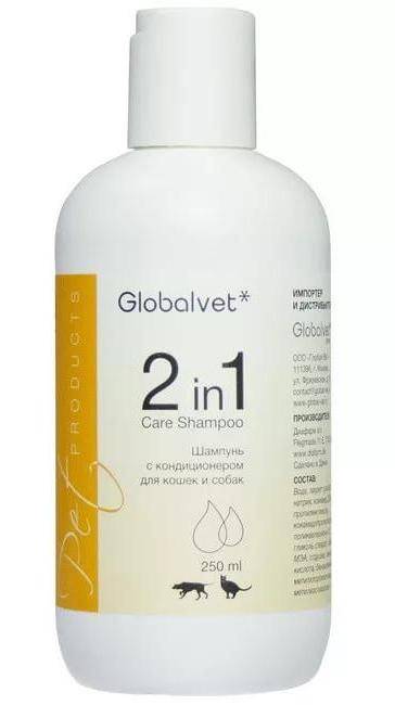 Шампунь-кондиционер Глобалвет 2 в 1 — косметико-гигиеническое средство для ухода за кожно-волосяным покровом животных, при местном нанесении обладает увлажняющими и тонизирующими свойствами, хорошо смешивается с водой, обладает превосходными пенообразующими и моющими свойствами.