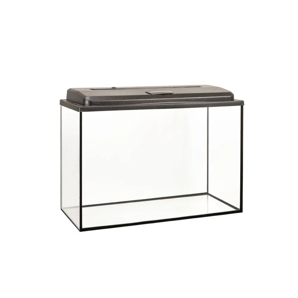 Аквариум с черной крышкой, с лючком для кормления рыб и двумя встроенными люминисцентными лампами.