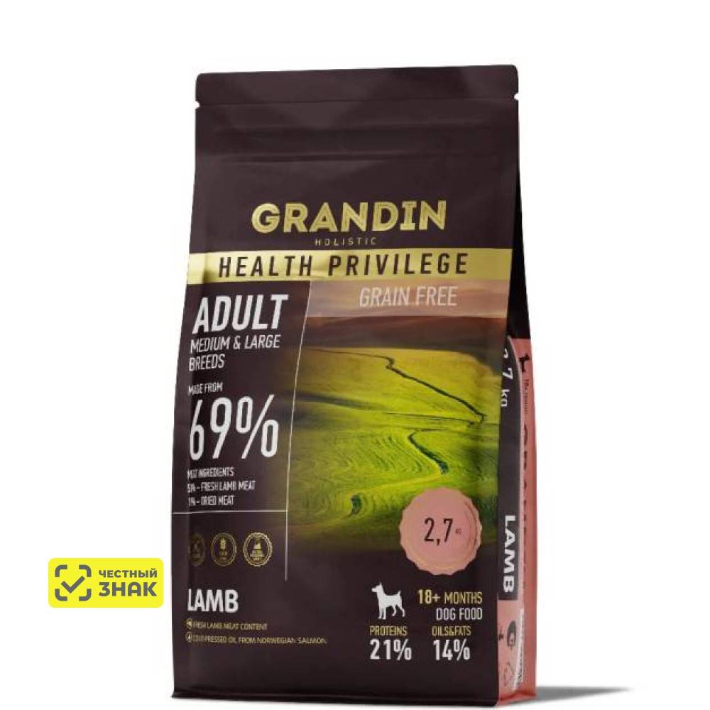 GRANDIN Adult Medium & Large Breeds Lamb – холистик корм для взрослых собак средних и крупных пород, с ягненком. Новая улучшенная формула питания: свежая ягнятина с на ломтиках тыквы с ягодами клюквы понравится вашему питомцу!